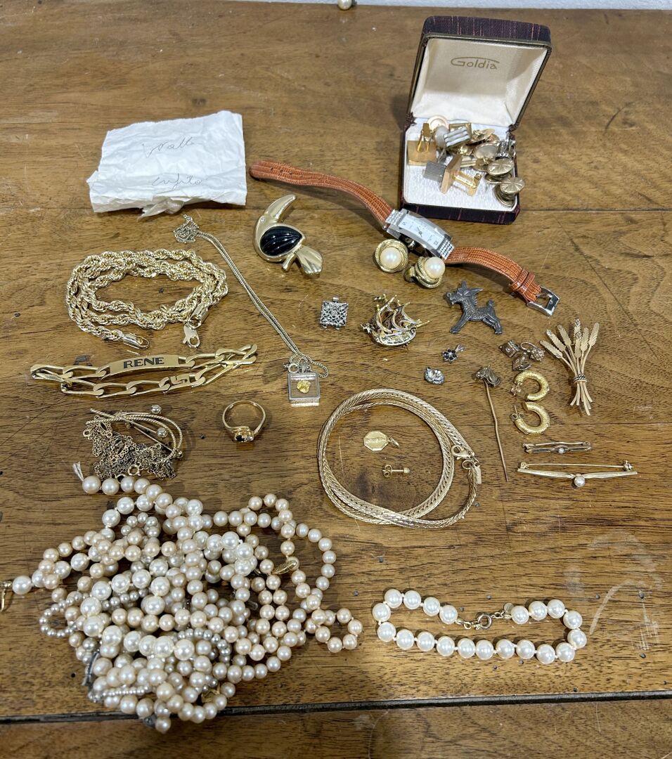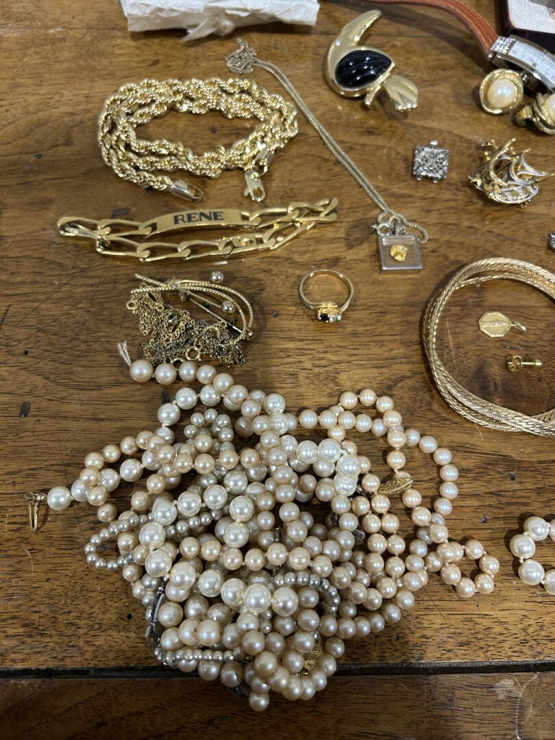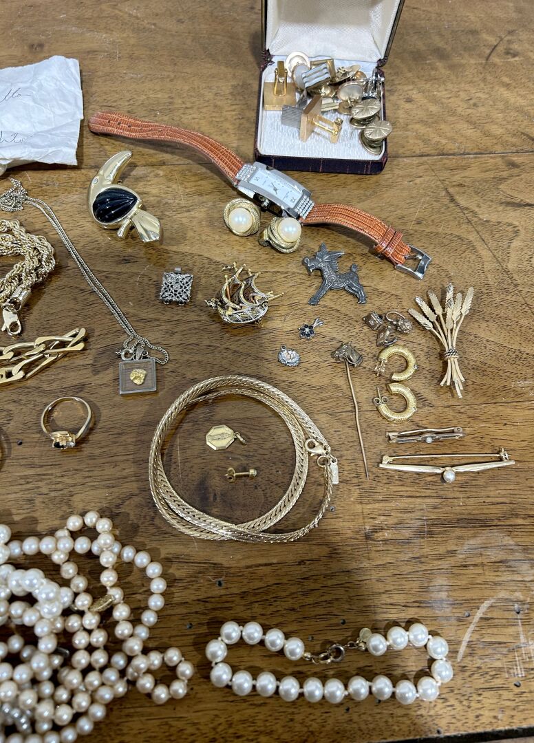 Ensemble de bijoux fantaisie, boutons de manchette, collier de perles et divers