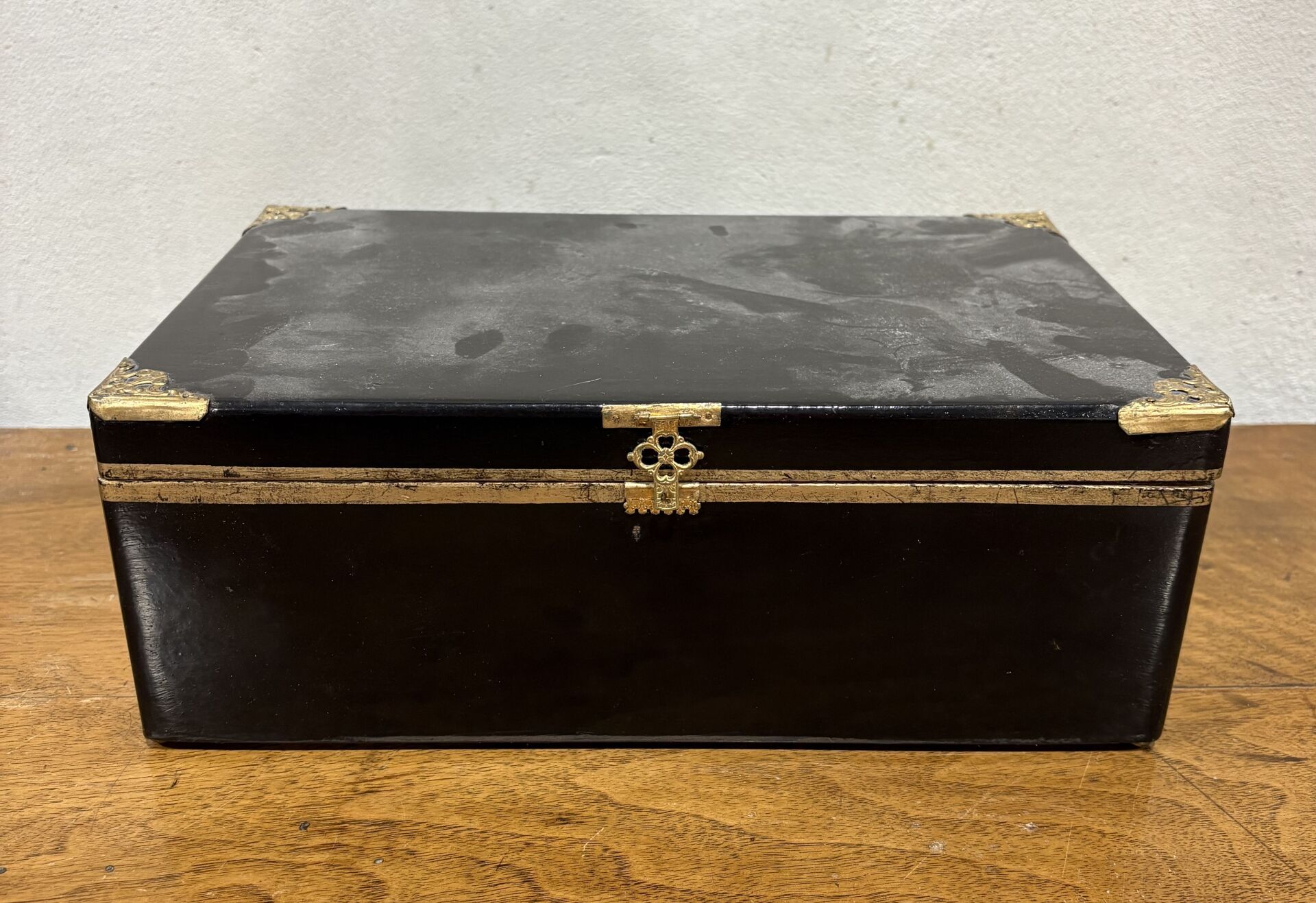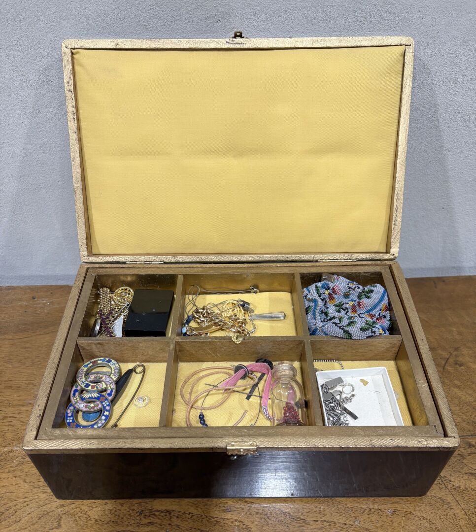 42 ESTIMATION: 30 / 50 € Boite à bijoux en bois peint noir et or contenant un petit lot de bijoux fantaisie et bibelots dont boucle de ceinture en émaux cloisonnés, porte souvenirs en argent, petit pochon de perles, gourmette en métal doré …