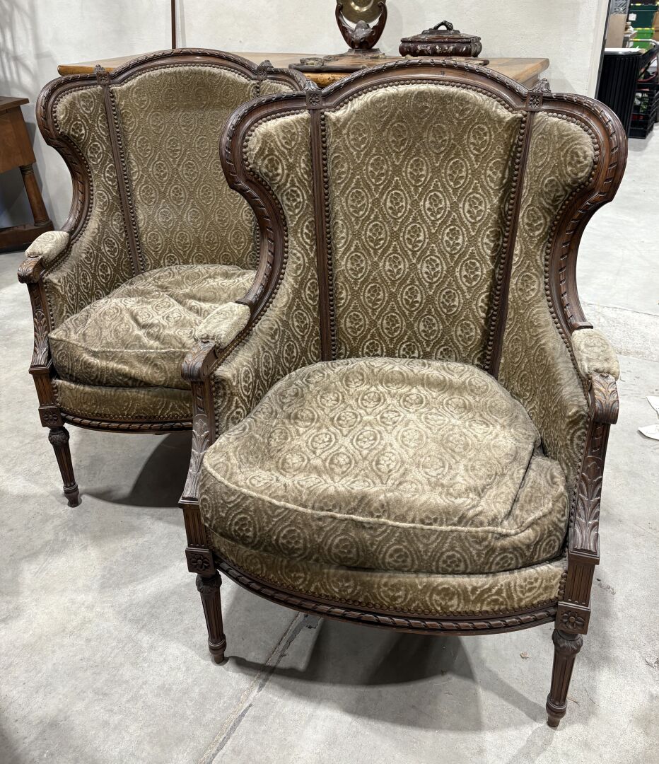 Paire de bergères à oreilles en bois naturel mouluré et sculpté à décor de feuilles d’acanthe, rubans et rosaces, reposant sur quatre pieds fuselés cannelés, couverture de velours gaufré à décor de fleurs