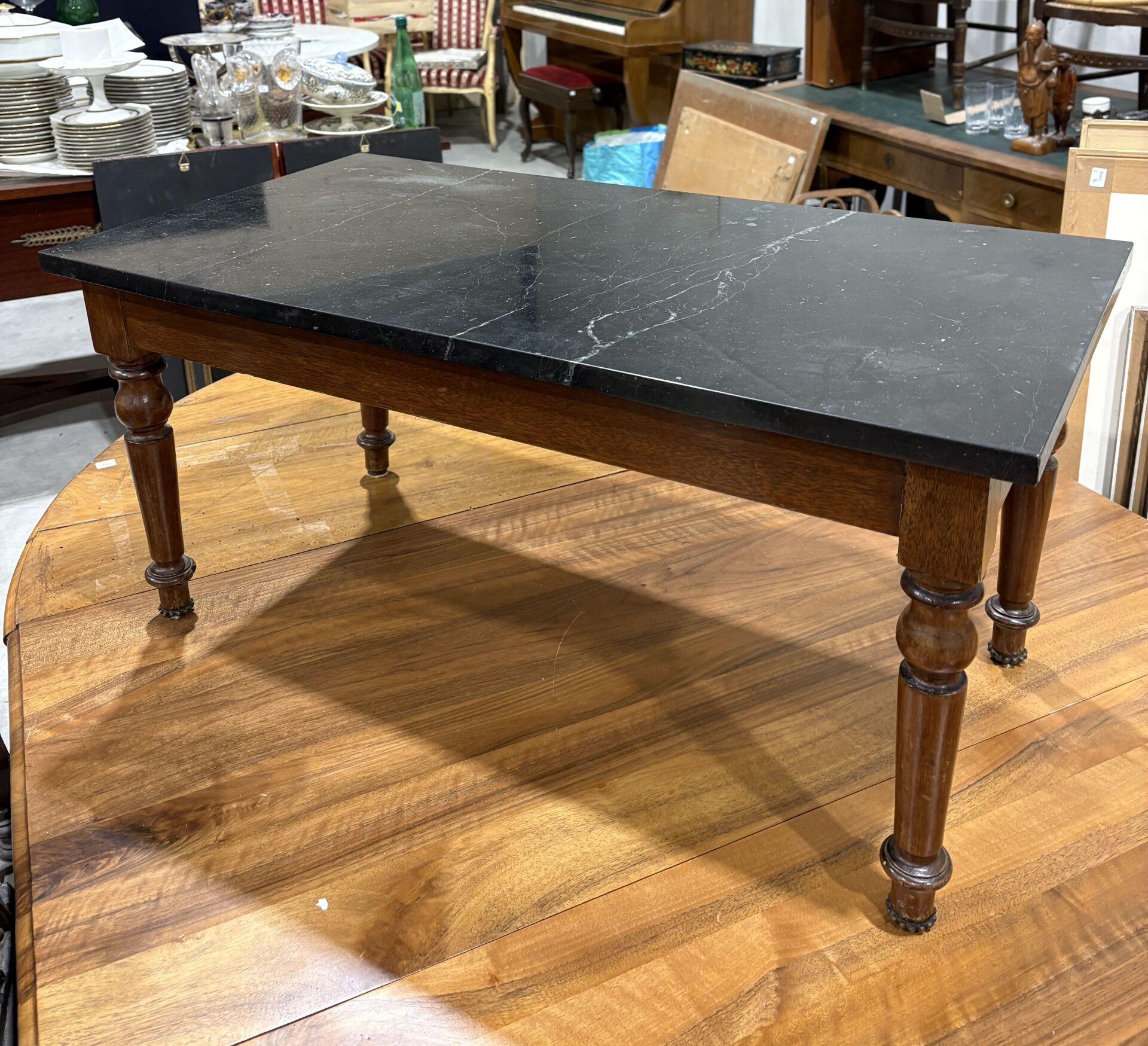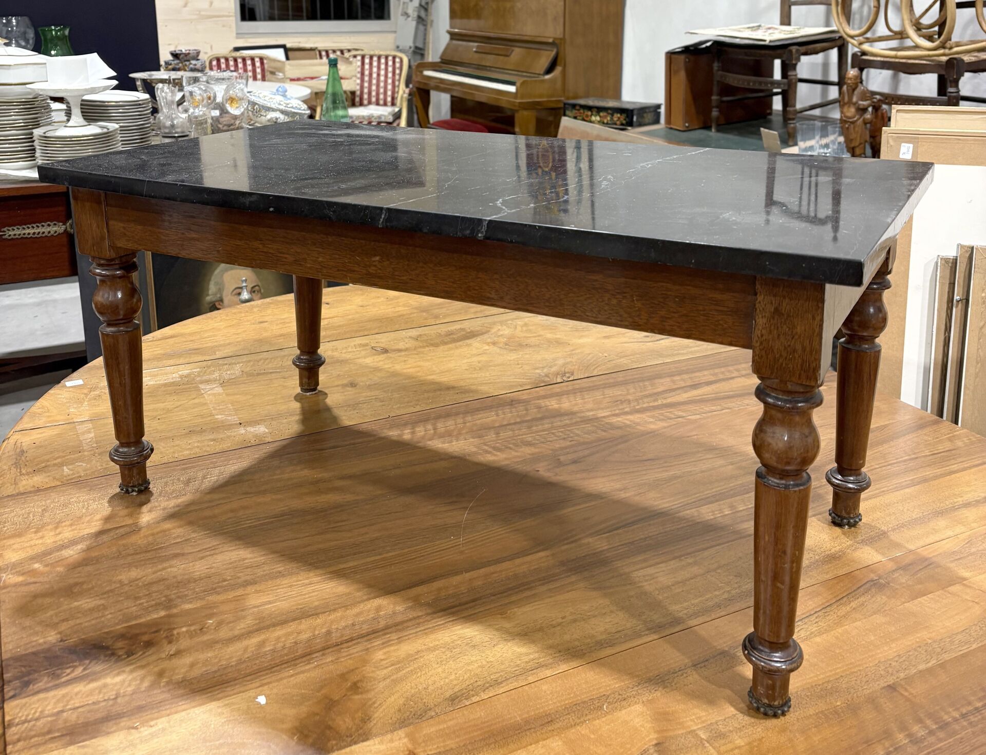 76 ESTIMATION: 50 / 80 € Table basse en acajou et placage d’acajou reposant sur quatre pieds tournés, dessus de marbre noir veiné blanc H : 38.5 – L : 82 – P : 43 cm