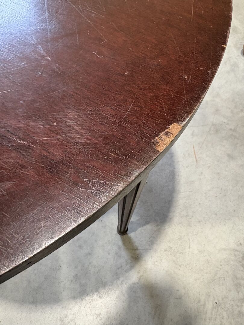 Table ronde d’appoint en bois naturel teinté reposant sur quatre pieds fuselés cannelés, les quatre pieds fixés sur glissières permettant d’ajouter une extension de plateau.