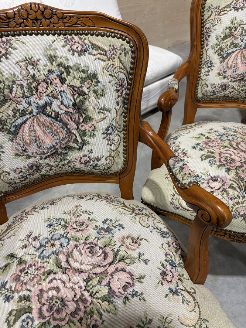 83 ESTIMATION: 10 / 20 € Paire de fauteuils de style Louis XV Couverture à décor de scènes galantes Travail moderne H : 85 cm