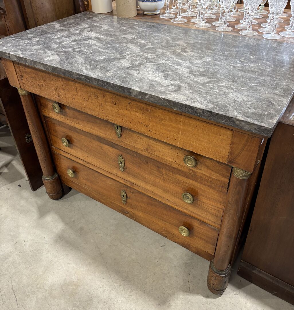 86 ESTIMATION: 80 / 120 € Commode à quatre tiroirs en placage de bois précieux, décor de colonnes dégagées, dessus de marbre gris État d’usage H : 90 – L : 114 – P : 60 cm