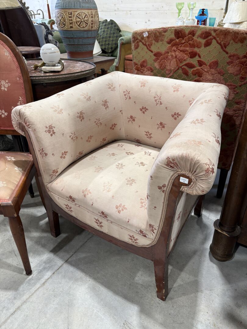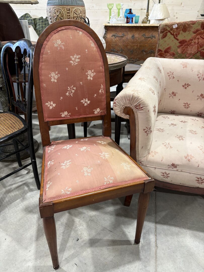 88 ESTIMATION: 10 / 20 € Bergère carrée et chaise de style Anglais en bois de placage (accidents), couverture de tissus rose à décor de jeté de fleurs, fanée Fauteuil : H : 68 – L : 80 – P : 60 cm Chaise : 93 cm