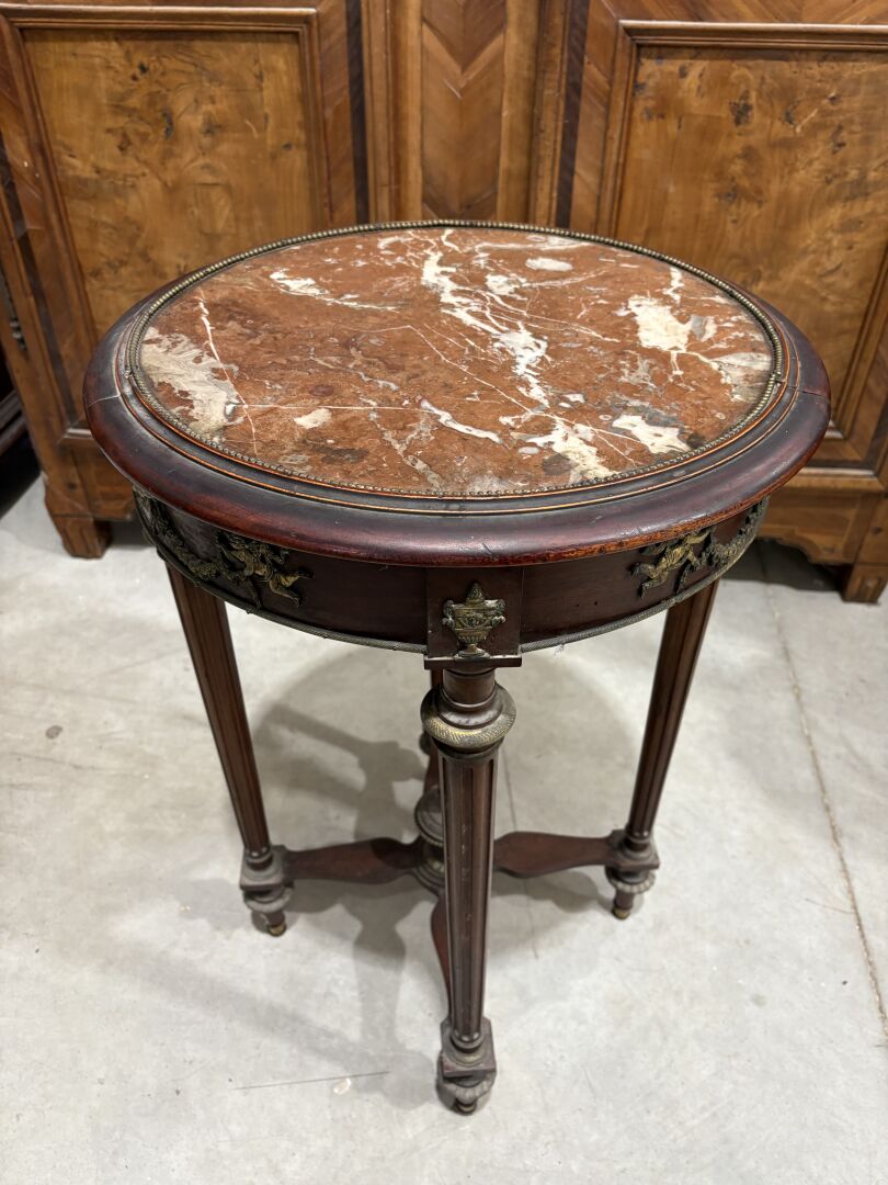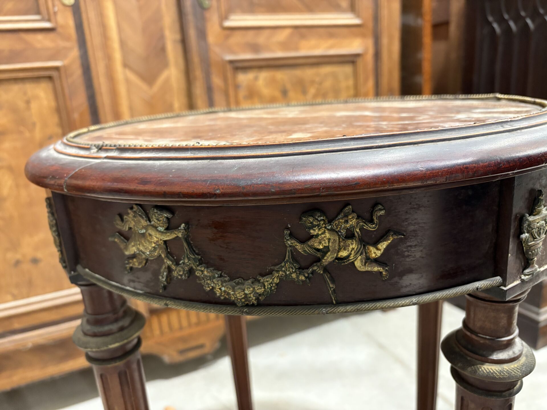 Petit guéridon circulaire, dessus de marbre brèche rouge, garnitures de bronzes à décor de guirlandes végétales et putti, reposant sur quatre pieds cannelés fuselés reliés par une entretoise en X centrée d’un pot à feu