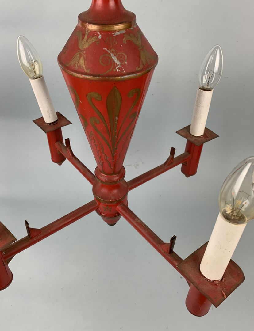 110 RÉSULTAT: 110 € ESTIMATION: 50 / 80 € Lustre à quatre lumières en tôle peinte rouge et or à décor d’entrelacs Travail XIX° H : 44 cm