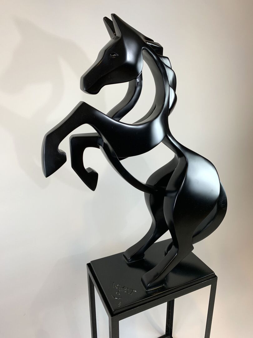 224 RÉSULTAT: 2700 € ESTIMATION: 300 / 500 € Eric VALAT (1961) Cheval cabré Sujet en résine sur un socle en métal laqué noir, signé et nuléroté sur la terrasse 5/8 H : 102 cm