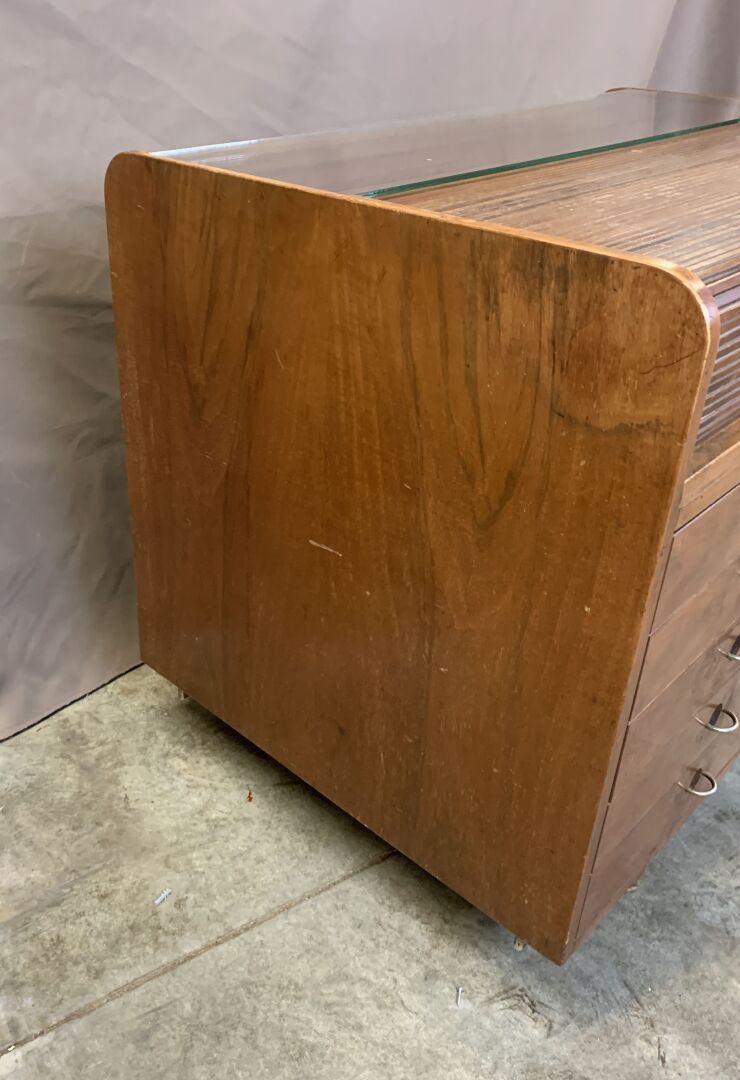 Bureau Modèle « 804 » en placage de noyer à sous mains rétractable dégagé sous un rideau coulissant, intérieur aménagé de tiroirs et de cases, ouvrant en façade à dix tiroirs, façade aménagée d’étagères. Il repose sur quatre pieds cylindres.