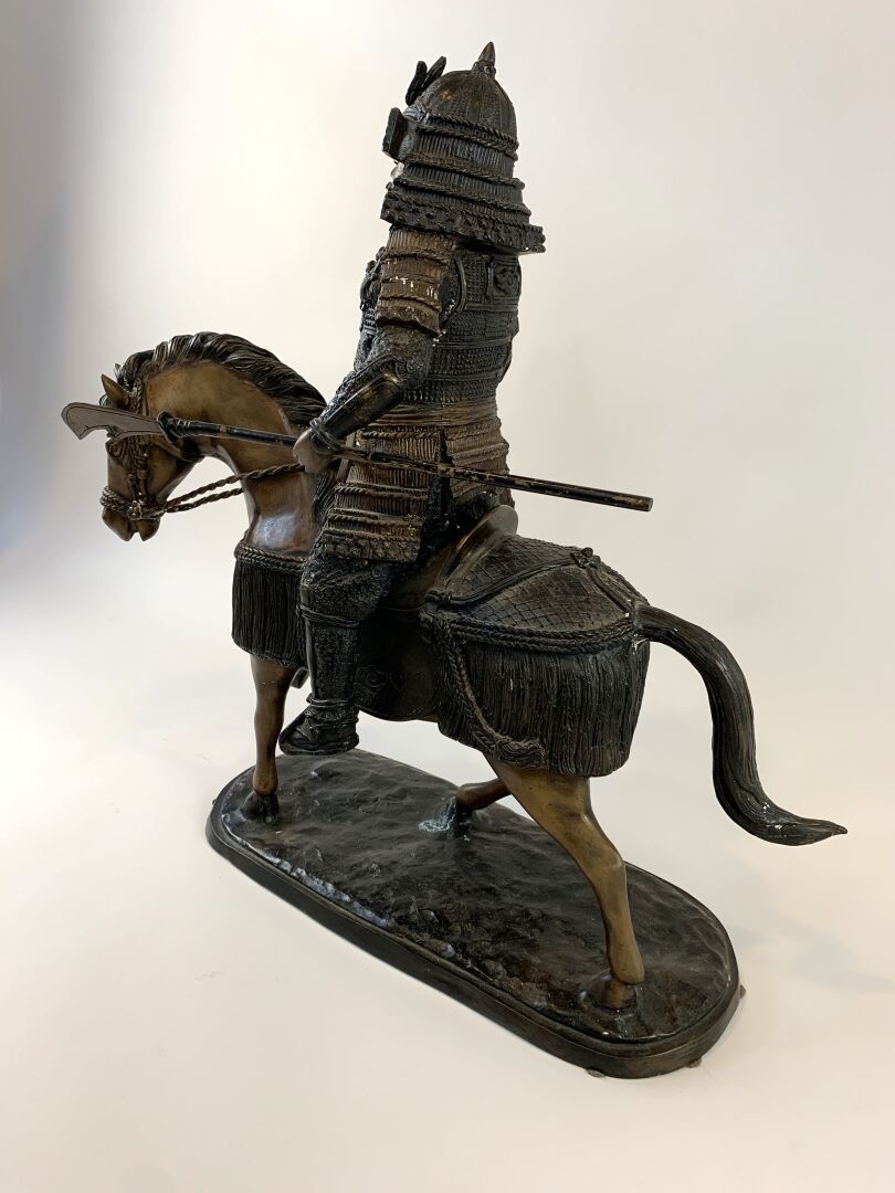 49 RÉSULTAT: 500 € ESTIMATION: 600 / 800 € Groupe en bronze figurant un samouraï à cheval Travail de style japonnais, XX° siècle H : 64 – L : 72 – l : 22 cm