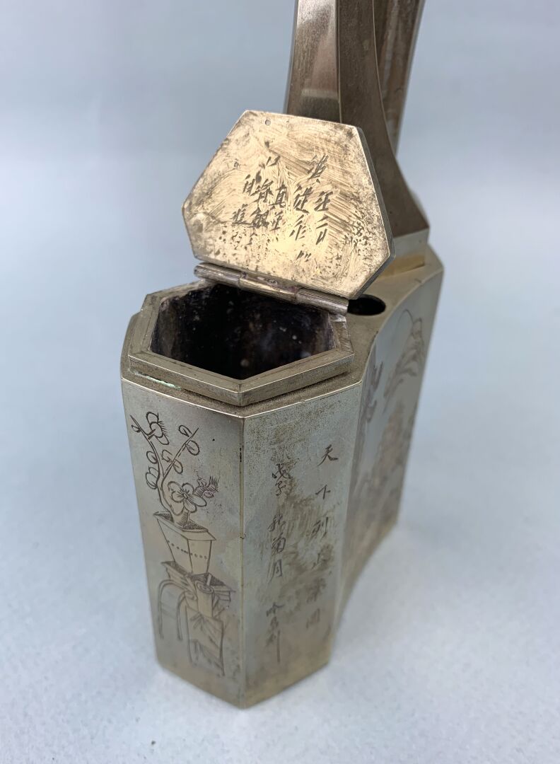 Pipe à eau en métal argenté à décor de personnages dans un paysage et calligraphies