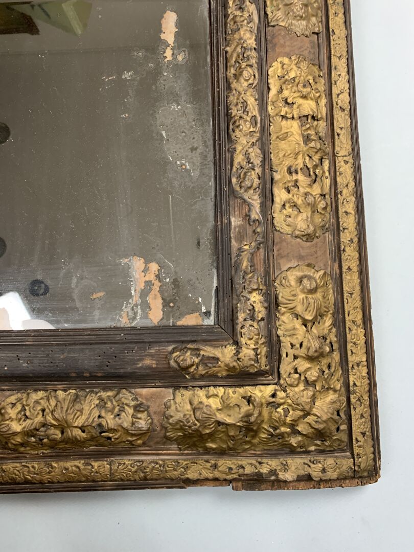 Miroir biseauté au mercure à riche encadrement à fronton de noyer orné en applique de motifs en laiton repoussé et ciselé, à décor de fleurs et feuillages.