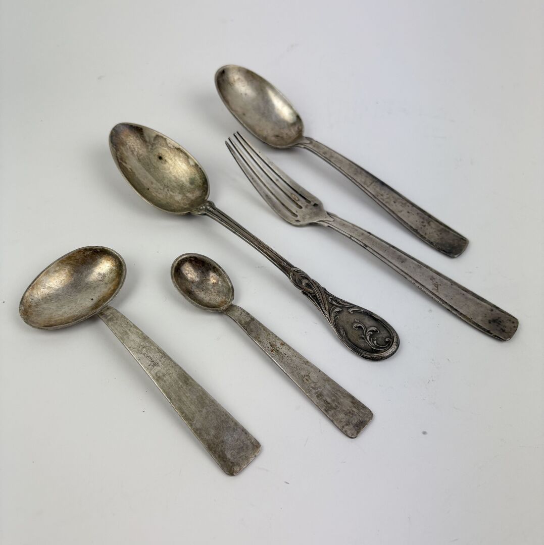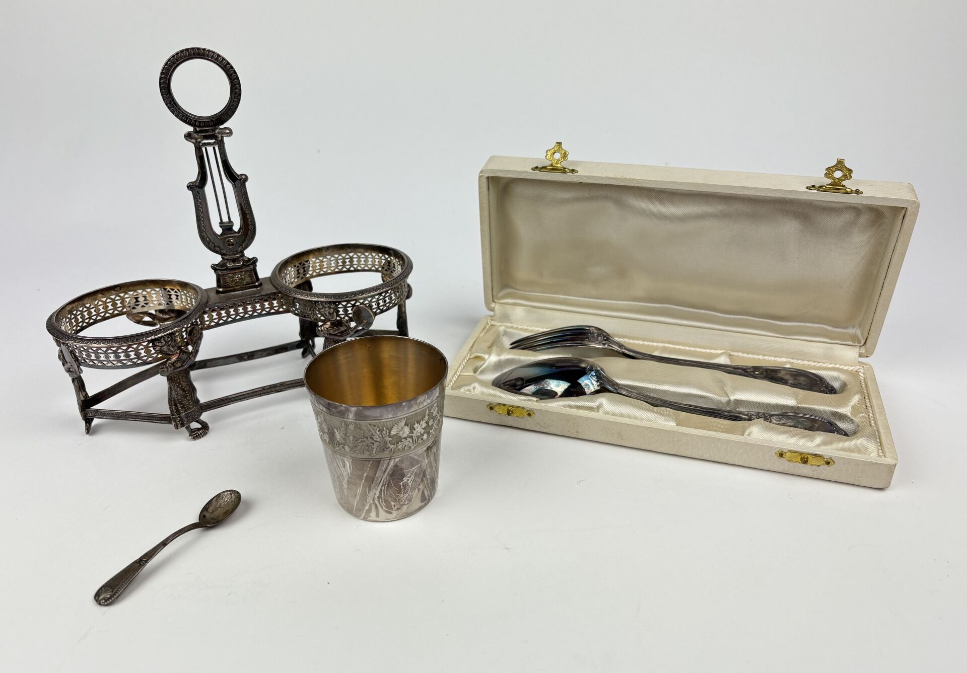 Ensemble en argent (925 millièmes), poinçon Minerve comprenant : - 1 Support d'huilier vinaigrier - 1 Couvert de naissance, sans son écrin - 1 Timbale - 1 Pelle à sel Poids : 310 g