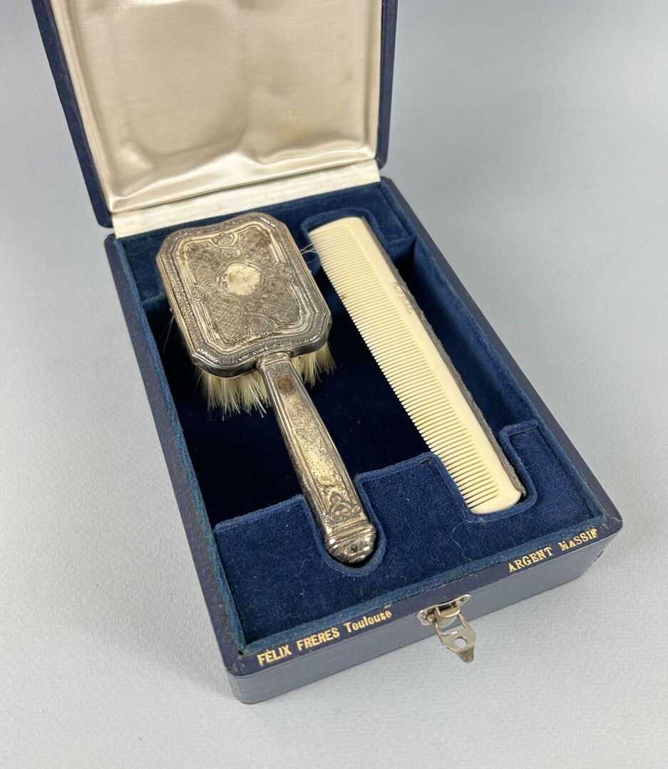 Félix Frères Coffret de toilette en argent fourré le peigne à l'imitation de l'ivoire Poids Brut : 93 g.