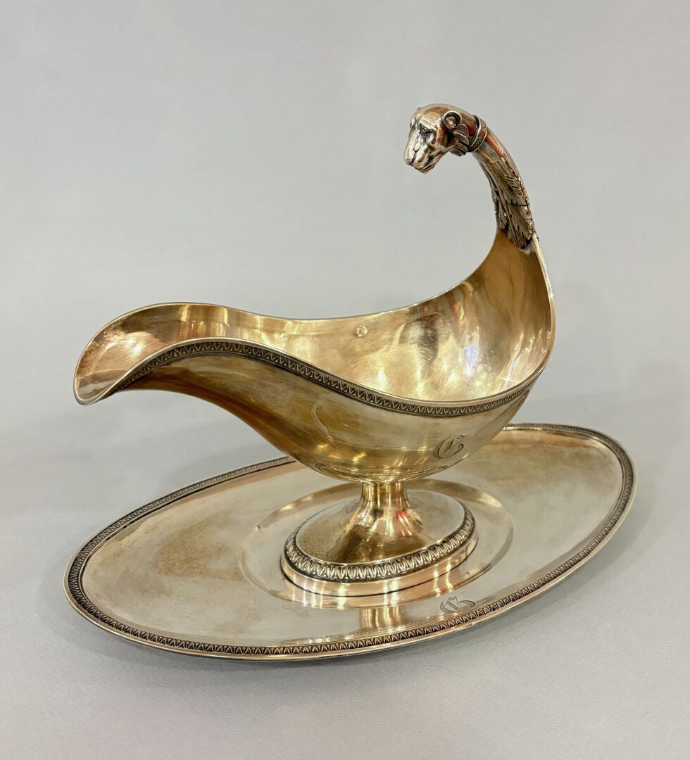 Importante saucière en argent au premier coq la prise formant une gueule de lion, la saucière à bec et son dormant son orné d'une frise de palmette Maitre Orfèvre : GAB Travail d'époque Empire Poids : 677 g.