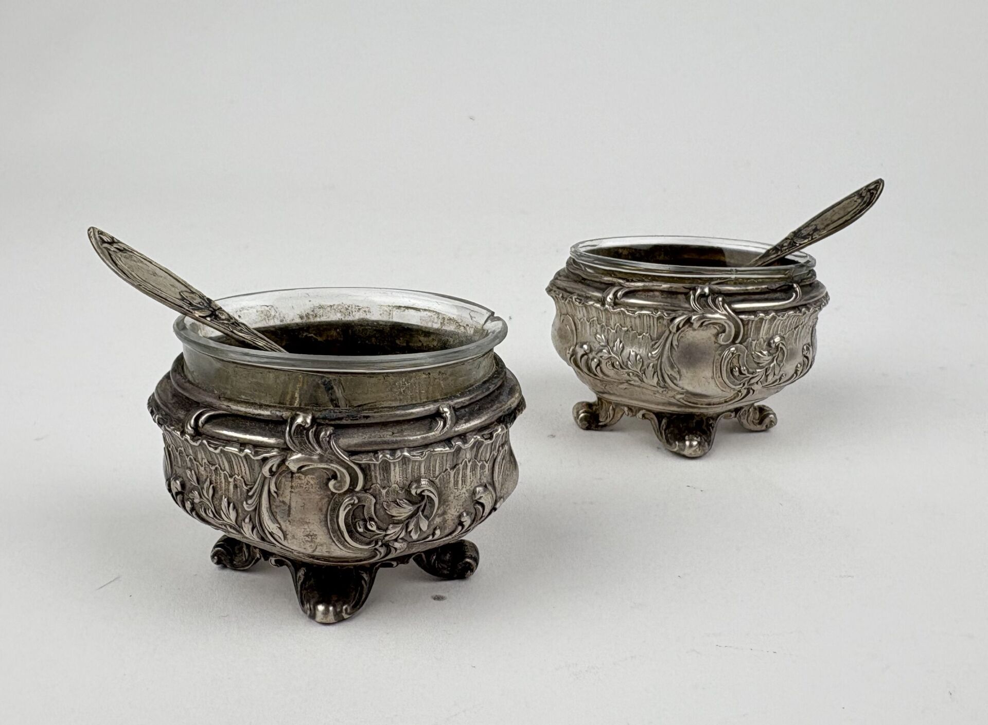 Paire de salerons en argent, poinçon minerve à décor rocaille Verrines accidentées Poids : 50 g hors verrines