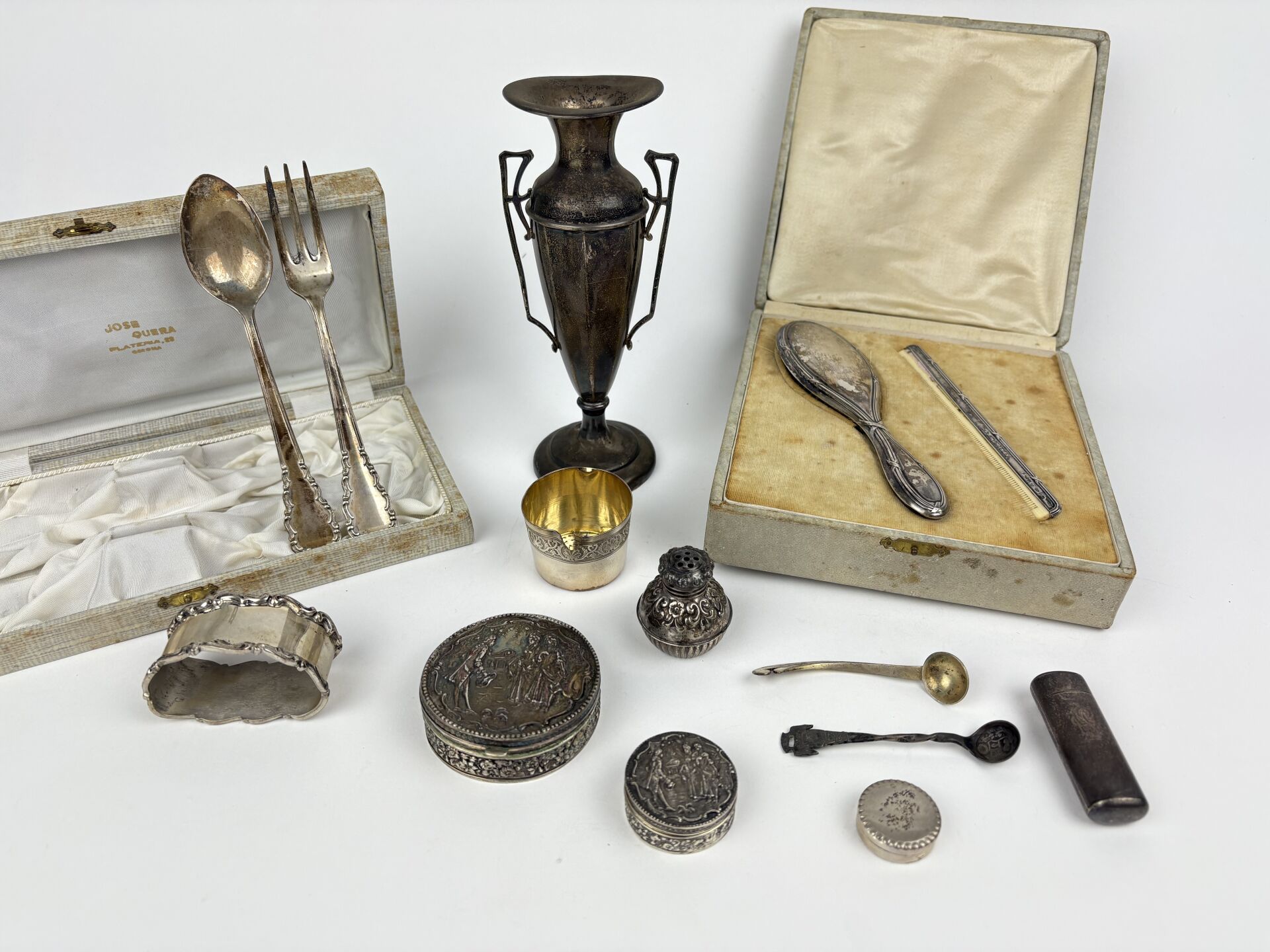 Lot en argent notamment espagnol comprenant : - 1 Couvert de naissance et son rond de serviette, dans un écrin - 3 Piluliers - 1 Soliflore - 1 Passe thé accidenté - 1 Petite salière Poids : 275 g On y joint une petite boite à