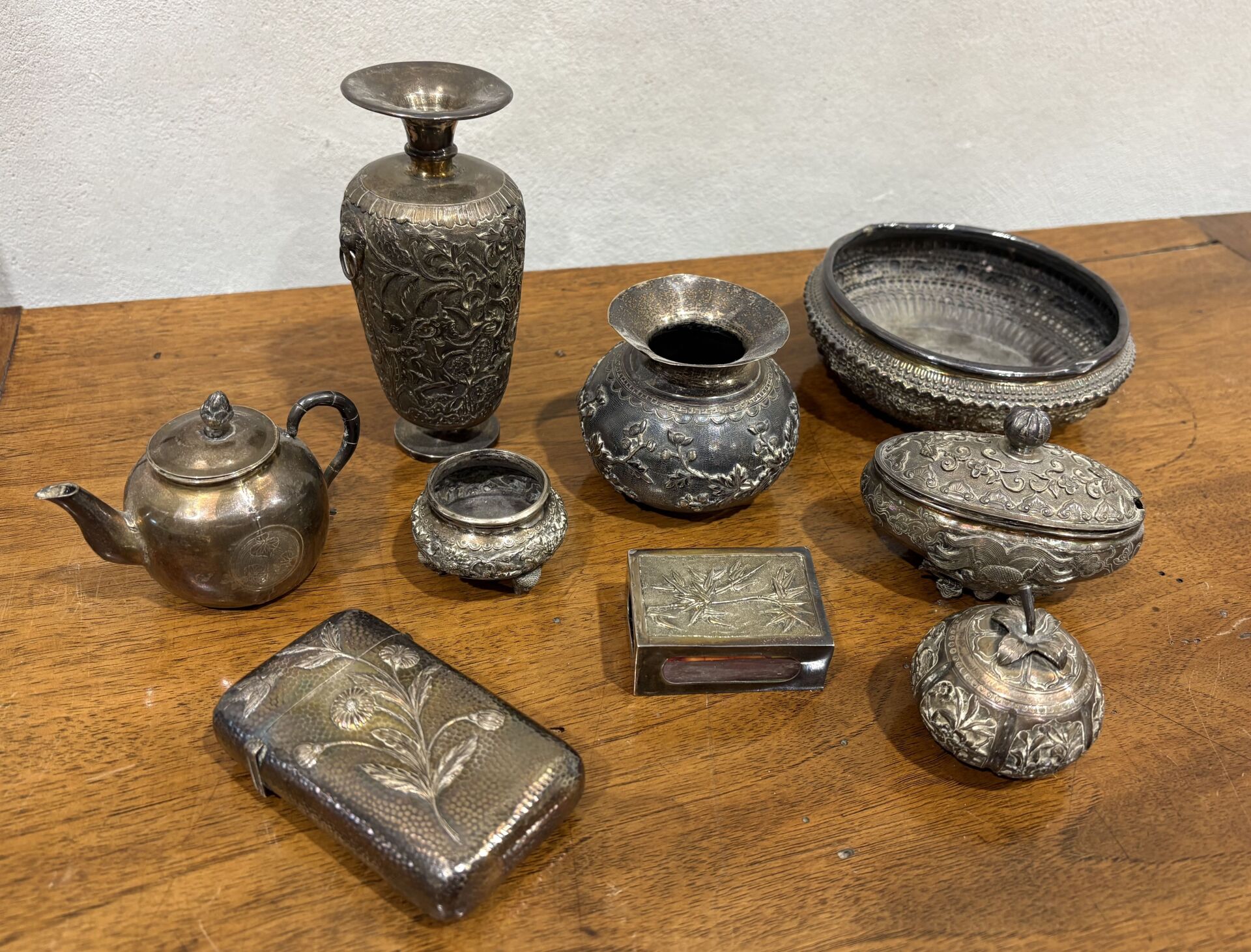 Ensemble de boites et vases en argent étranger à décor de dragons, bouquets de fleurs, animaux chimériques, chasse à l'éléphant