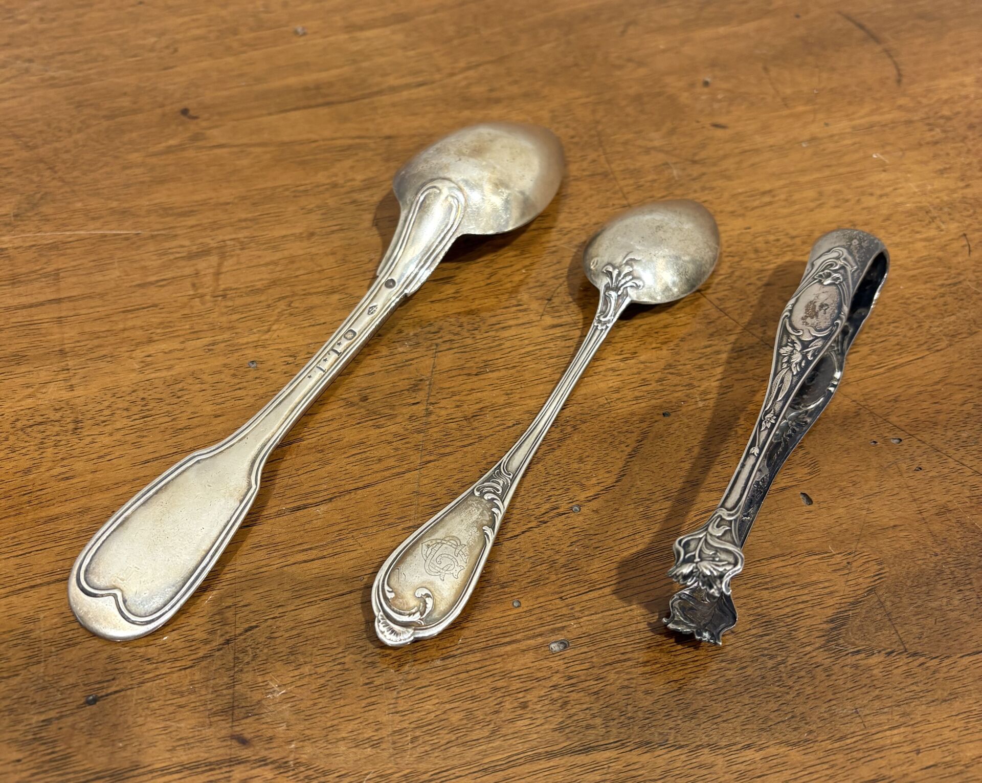 Cuillère en argent, poinçon Vieillard, modèle filet On y joint une cuillère à entremets en argent poinçon Minerve à décor Art nouveau chiffré CG et une pince à sucre en argent poinçon Minerve à décor Art Nouveau Poids : 160 g