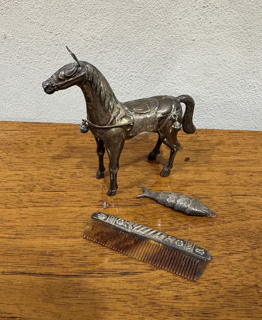 Cheval de parade en argent étranger flanqué de trois grelots On y joint un pendentif poisson en argent articulé et un petit peigne à barbe H cheval : 8 cm Poids brut : 41 g