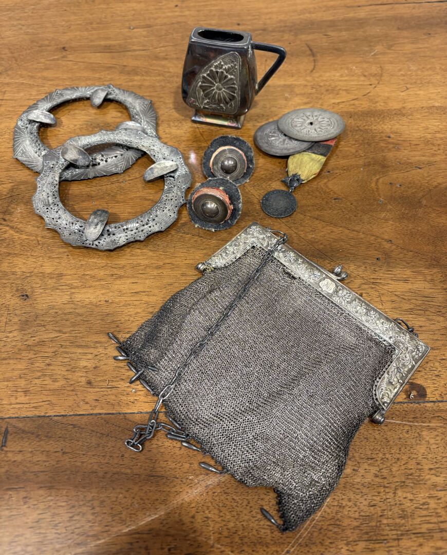 Ensemble composite en argent étranger comprenant une bourse chiffrée "GN" à décor d'idéogrammes, une petite verseuse, deux éléments de cendrier et divers Poids brut : 448 g