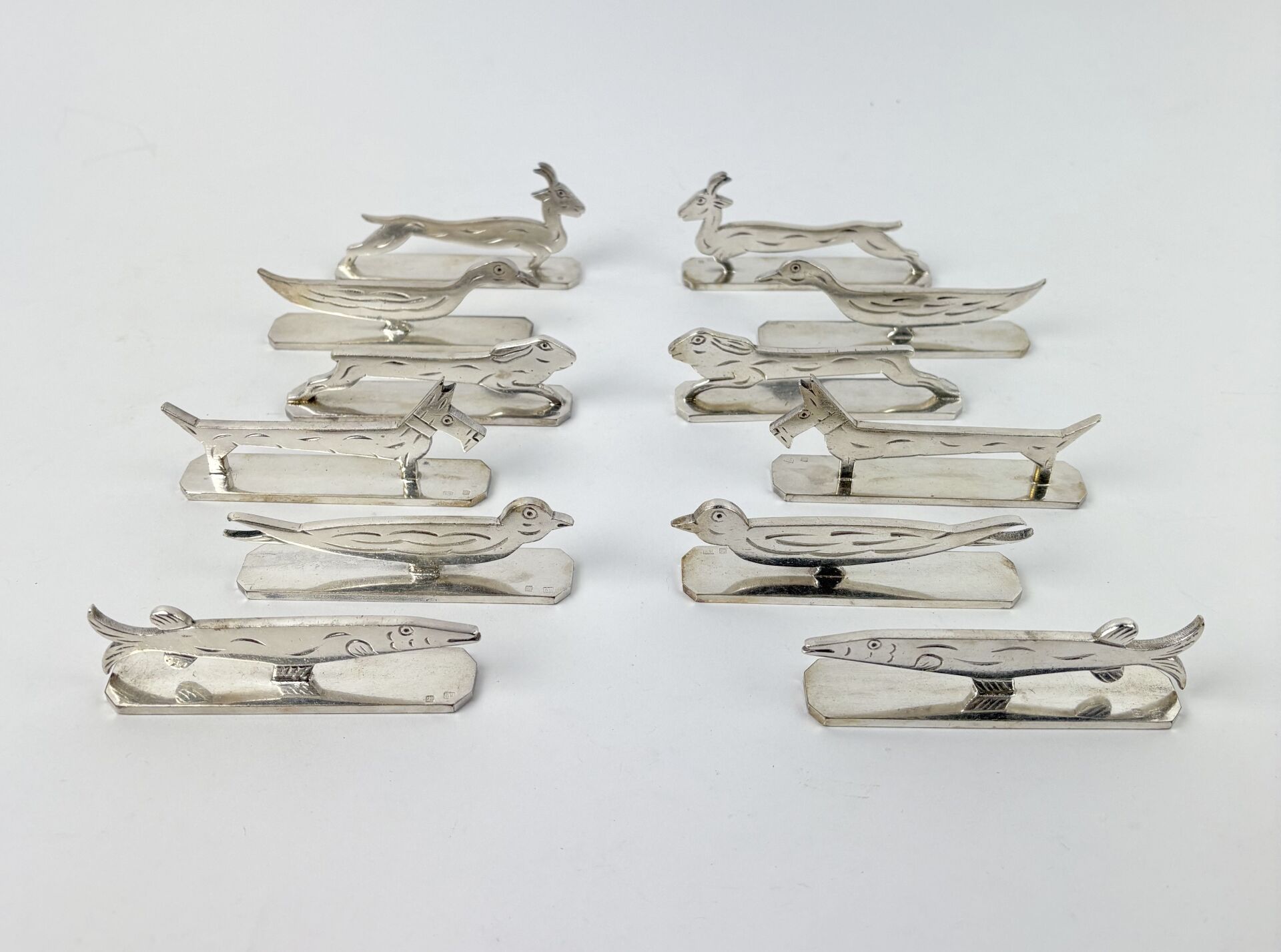 Suite de 12 porte-couteaux en métal argenté à décor d'animaux stylisés Travail vers 1930 Oxydations et usures L : entre 8 et 10 cm