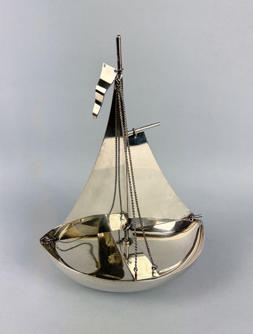Coupe apéritive en métal argenté figurant un voilier Manque un anneau de fixation au niveau de l'oriflamme Travail vers 1960 H : 23 cm