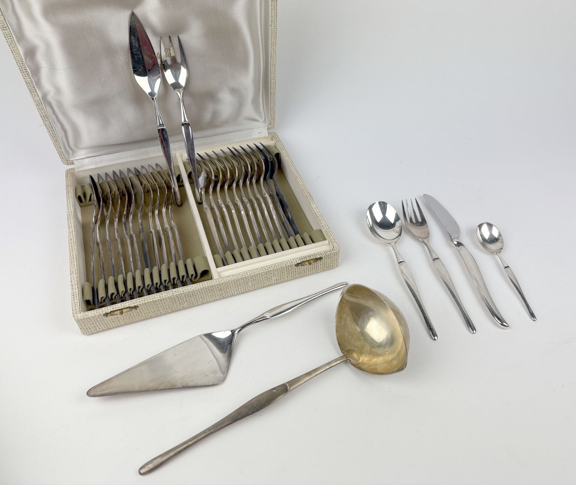Tapio WIRKKALA (1915-1985) pour CHRISTOFLE Modèle Duo - Partie de ménagère en métal argenté comprenant 118 pièces comme suit : - 12 Couverts - 12 Grands couteaux - 12 Couverts à poisson - 12 Petites cuillers - 1 Louche - 1 Pelle à gâteau Les couverts à poisson présentés dans un écrin de