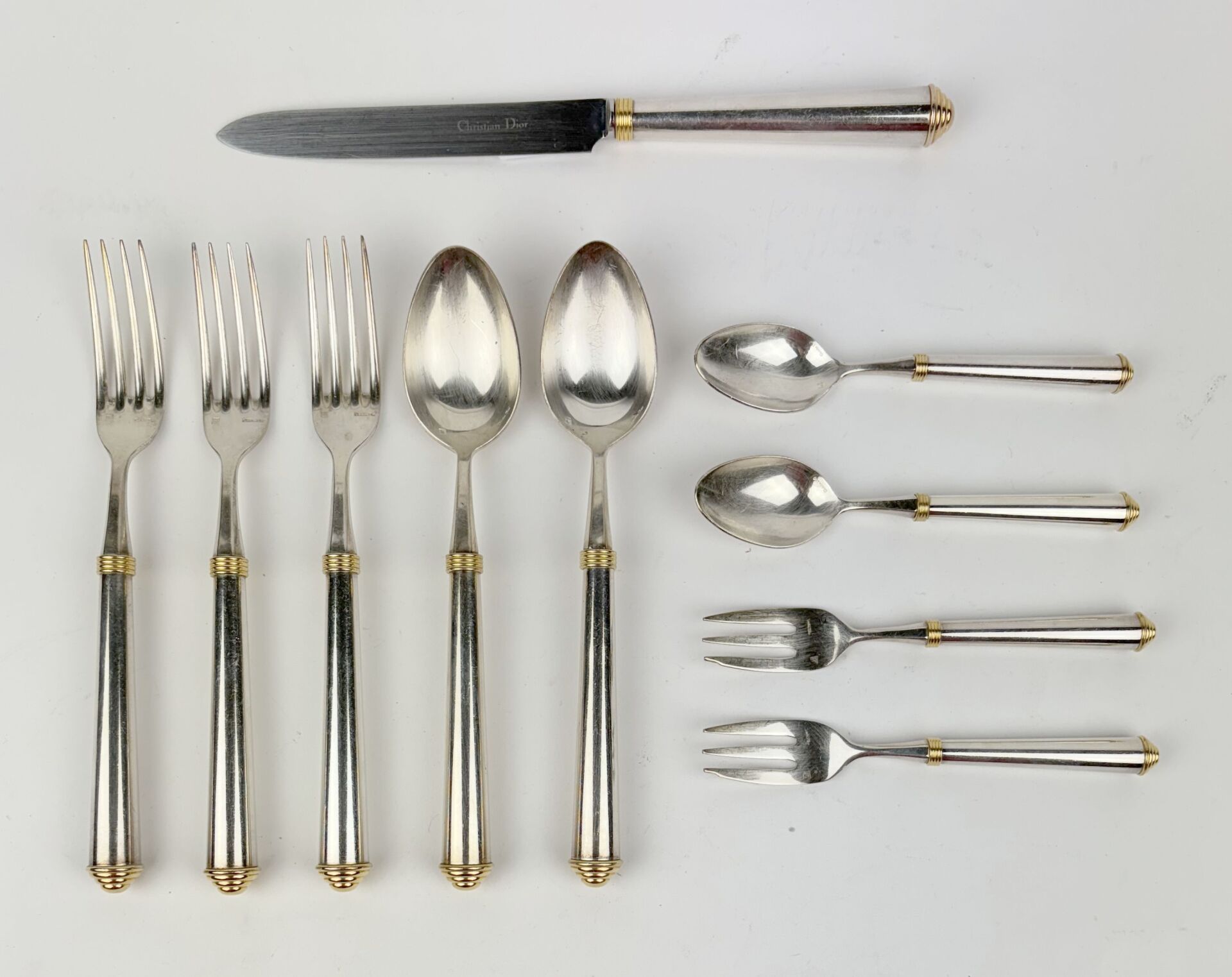 CHRISTIAN DIOR Lot de couverts en métal argenté et métal doré comprenant : - 3 Fourchettes de table - 2 Cuillères de table - 1 Couteau de table - 2 Fourchettes à dessert - 2 Cuillères à dessert