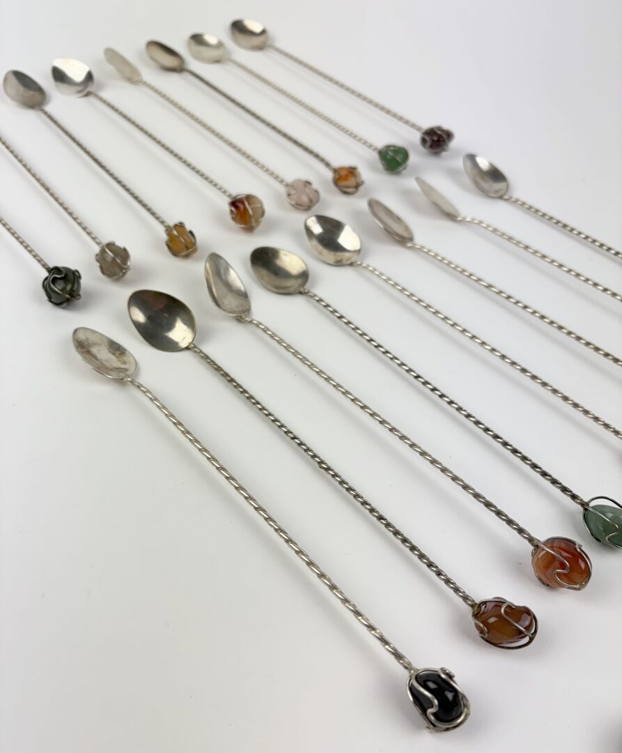Suite de 17 cuillères à cocktail en métal argenté et pierres dures Travail vers 1970 L : 19 cm
