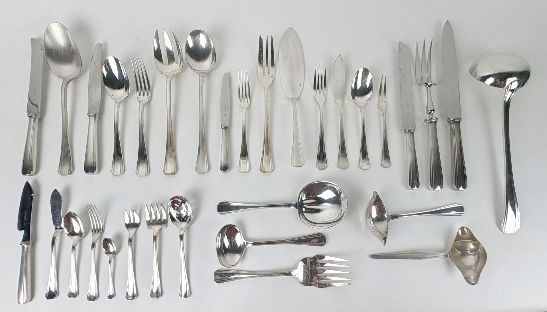 CHRISTOFLE Modèle Chevron - Partie de ménagère en métal argenté chiffrée "BC" comprenant : - 12 Couverts de table - 12 Couteaux de table - 12 Couverts à entremets - 12 Demi couteaux - 12 Cuillères à dessert - Cuillère de service - Couverts à salade -