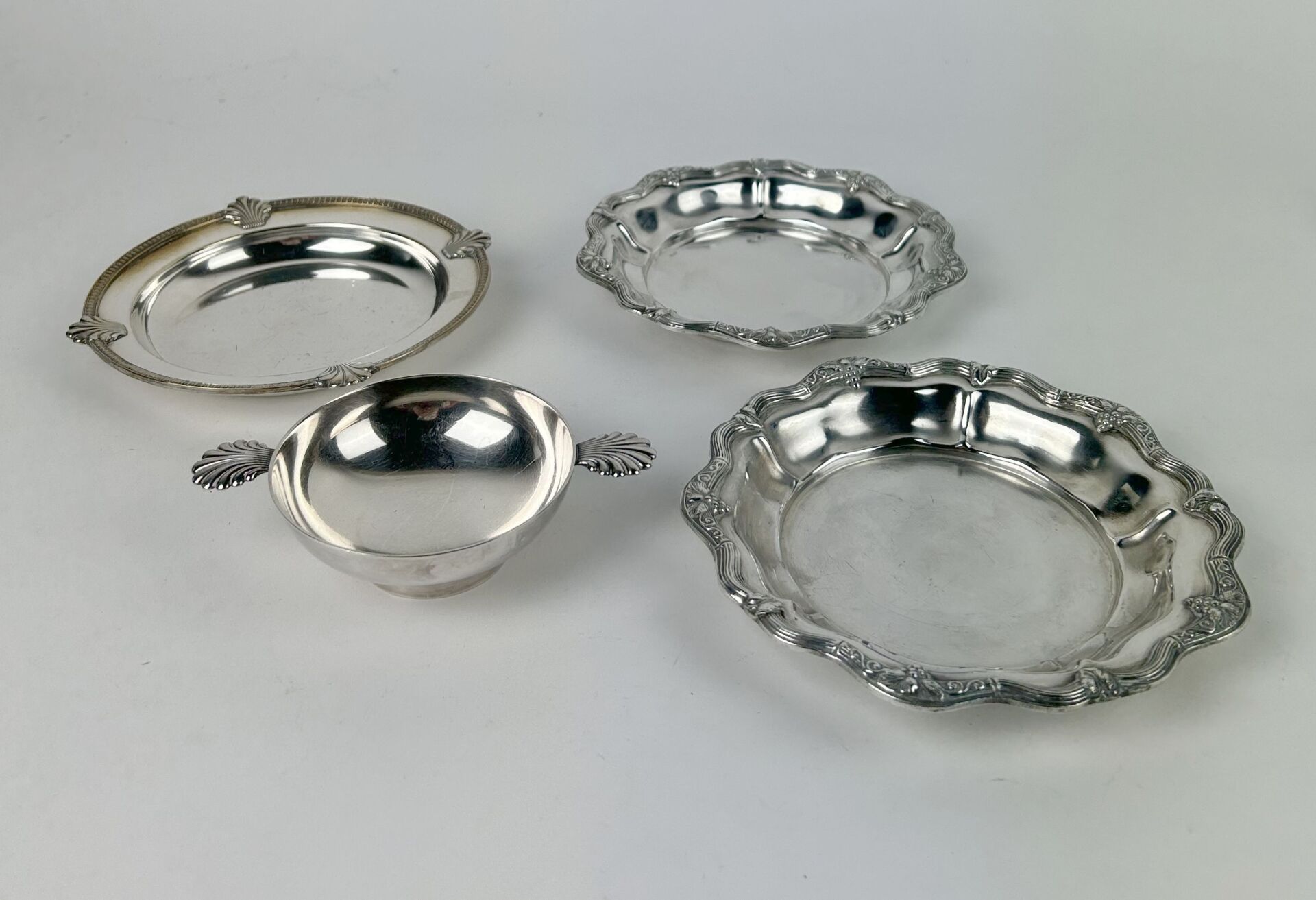 Ensemble en métal blanc comprenant trois dessous de bouteille, deux à décor de grappes de raisin et un à décor de filet de goderons et coquilles, On y joint une coupelle à deux anses formant coquille.