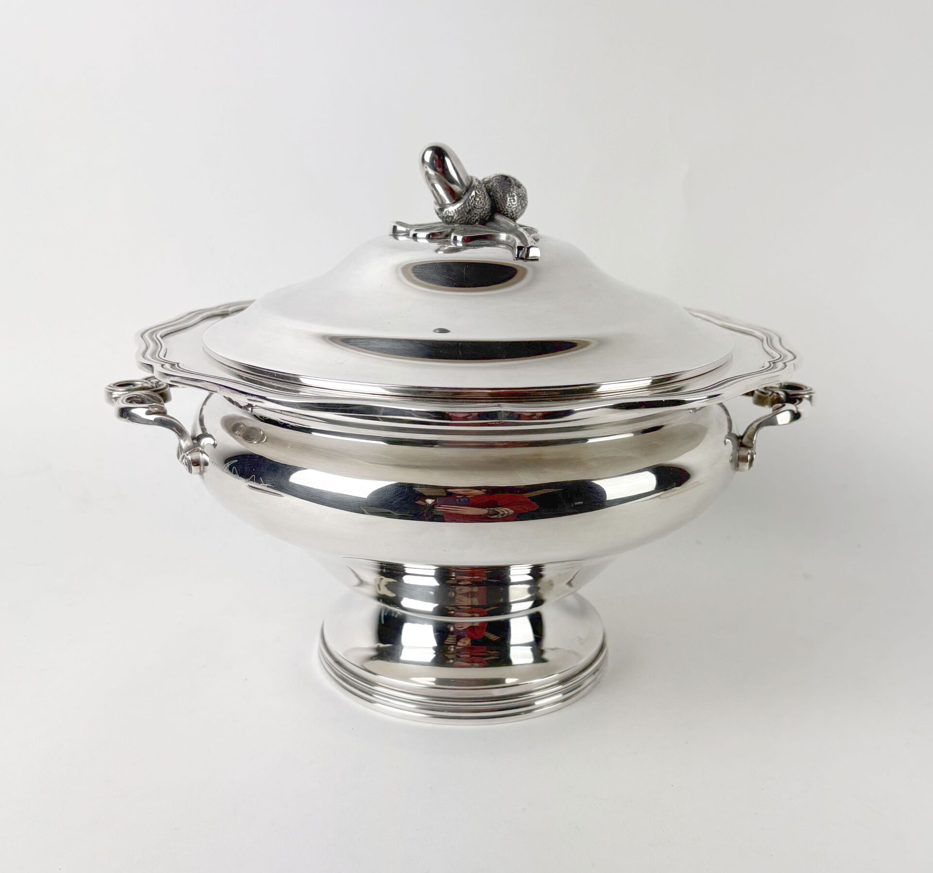 Soupière en métal argenté à bord chantourné, le frêtel à décor de glands