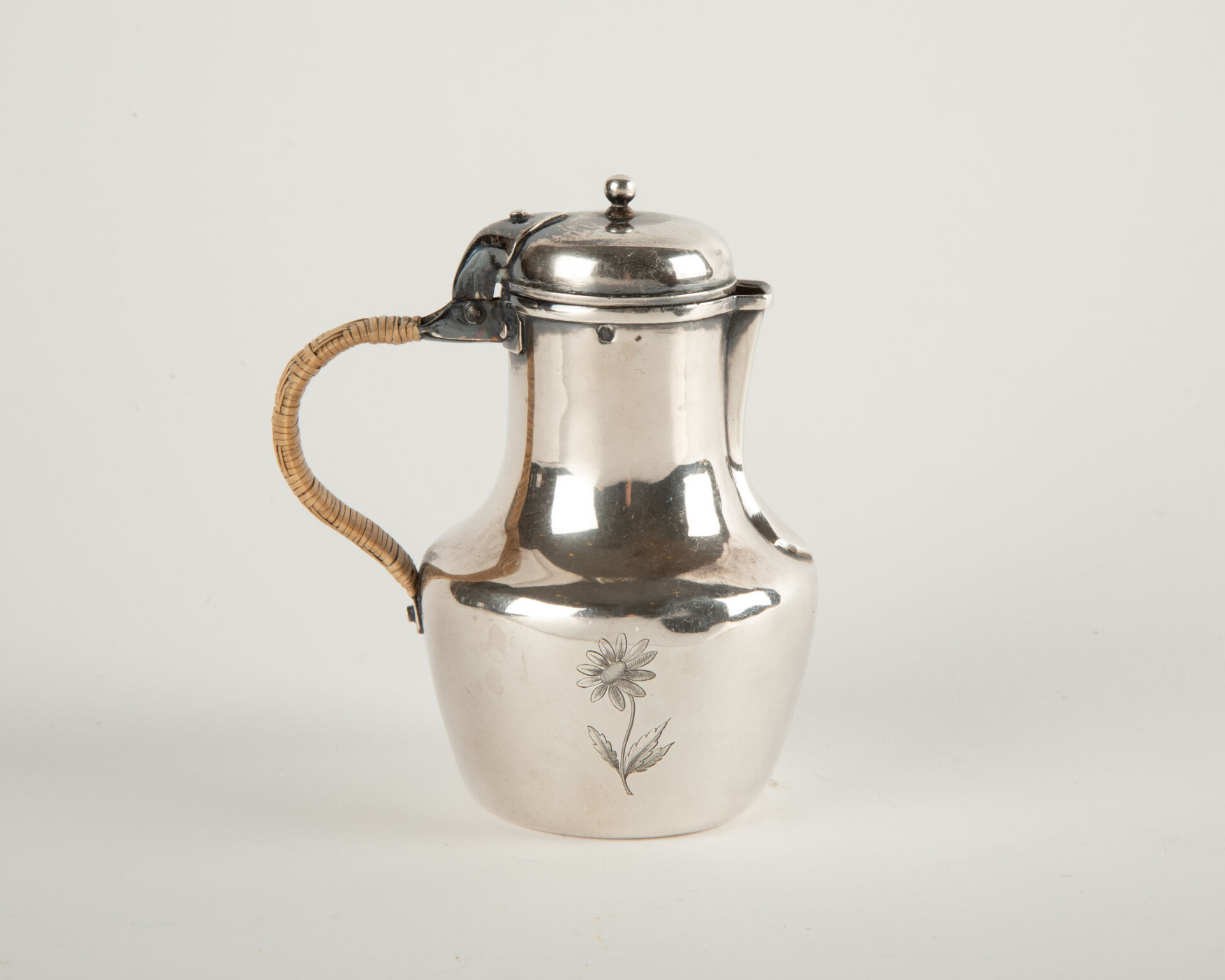 Verseuse égoïste en argent à prise en osier tressé, à décor gravé d'une fleur Chocs H : 10 cm Poids Brut : 103 g.
