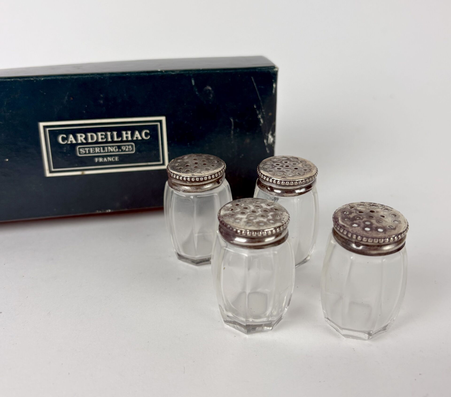 CARDEILHAC Suite de quatre salières individuelles en cristal et argent sterling (925 millièmes) Dans leur écrin Poids des montures : 7.2 g