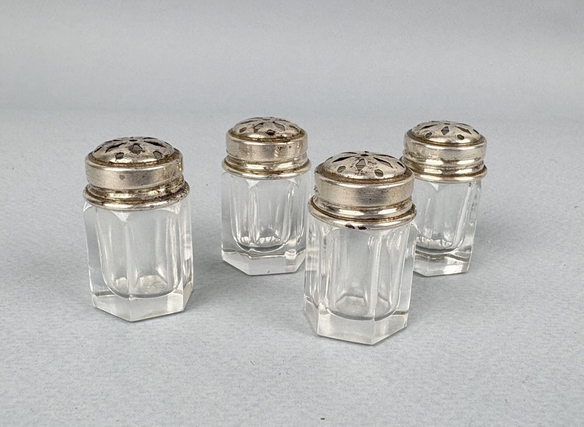 Suite de quatre salières individuelles en cristal à pans coupés et argent (925 millièmes) Poids des montures : 11.8 g
