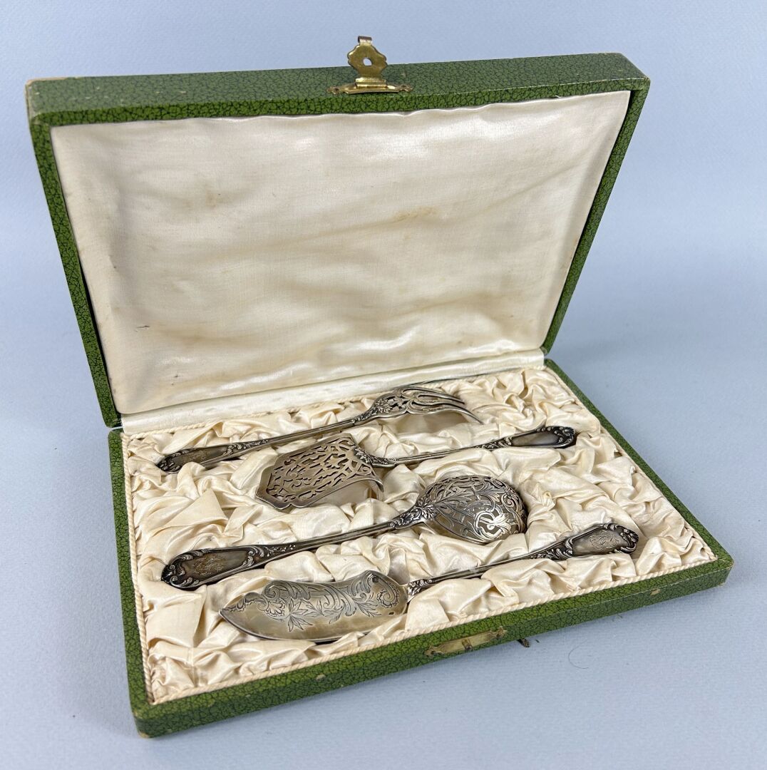 Coffret de 4 couverts à mignardises en argent (925 millièmes), poinçon Minerve Poids : 130 g