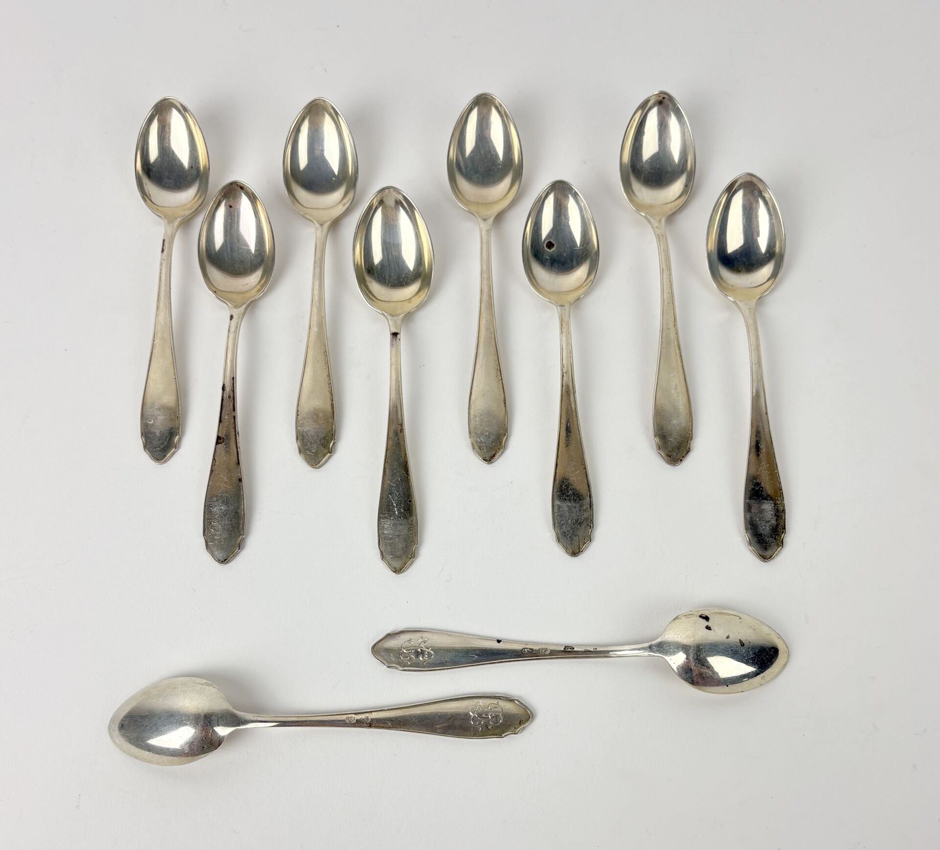 Suite de 10 cuillères à moka en argent étranger (Espagne) à manche violoné à filet et chiffrées "TC" Poids : 133 g