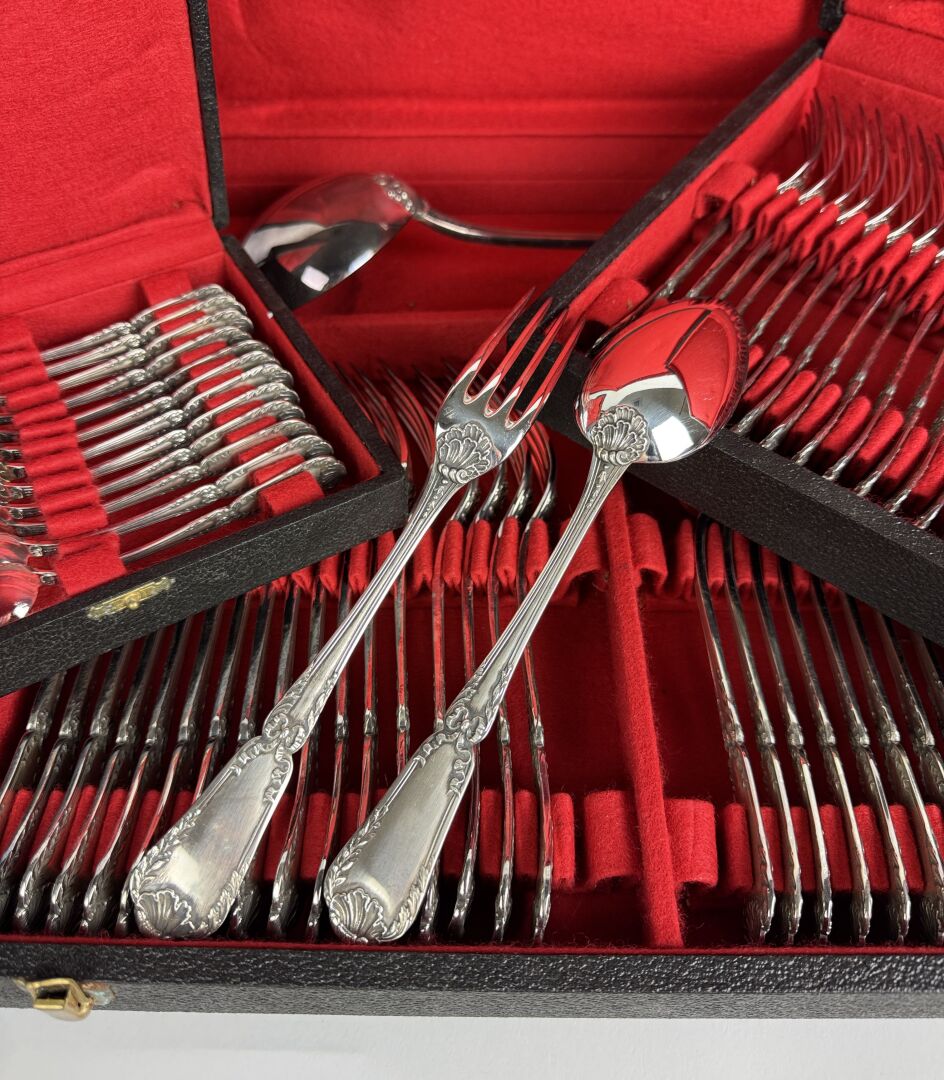 PUIFORCAT Partie de ménagère en argent (925 millièmes), poinçon minerve, à décor de coquille, frise de végétaux et rubans noués comprenant 85 pièces comme suit : - 18 Couverts - 18 Couverts à entremet - 12 Cuillères à dessert - 1 Louche Poids : 5.225 g Dans trois écrins