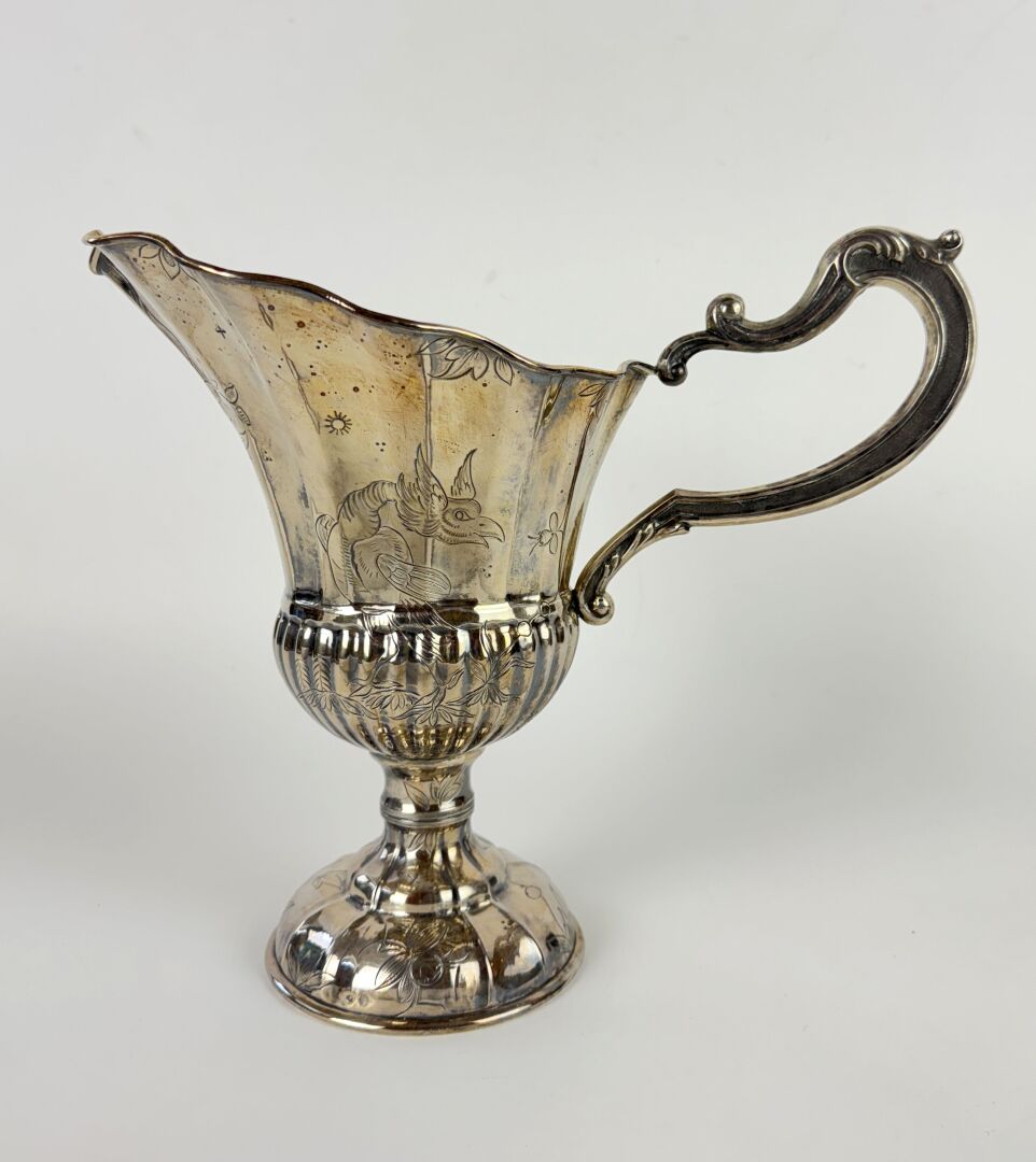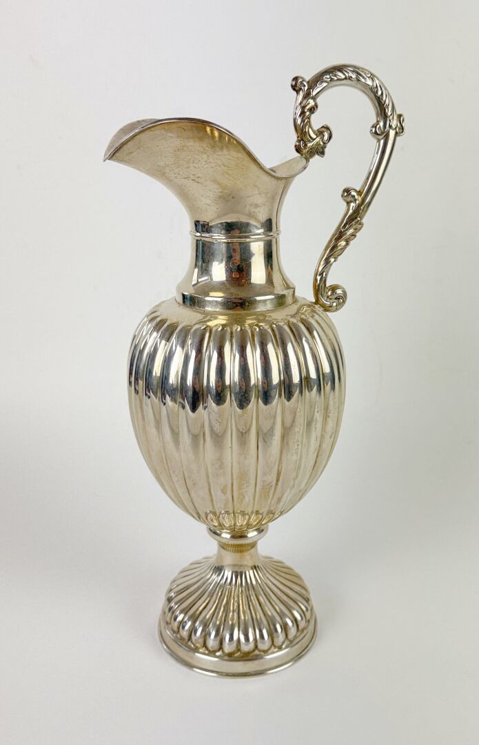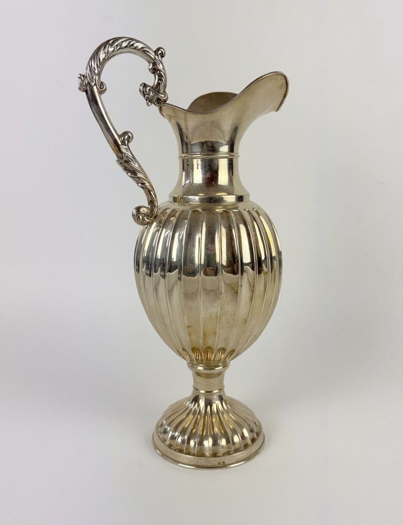 Aiguière en argent étranger reposant sur un piédouche, la panse et le pied godronnés en creux, large prise à décor de végétaux Travail espagnol XX° Pied lesté H : 34 cm Poids Brut : 714 g.