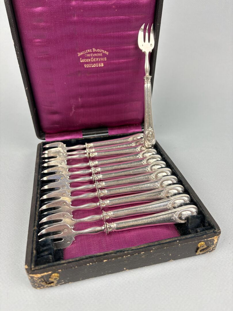 Suite de douze fourchettes à huitres en argent (925 millièmes), poinçon Minerve, manche en argent fourré flanqué d'un cartouche chiffré Dans leur écrin Poids brut : 320 g