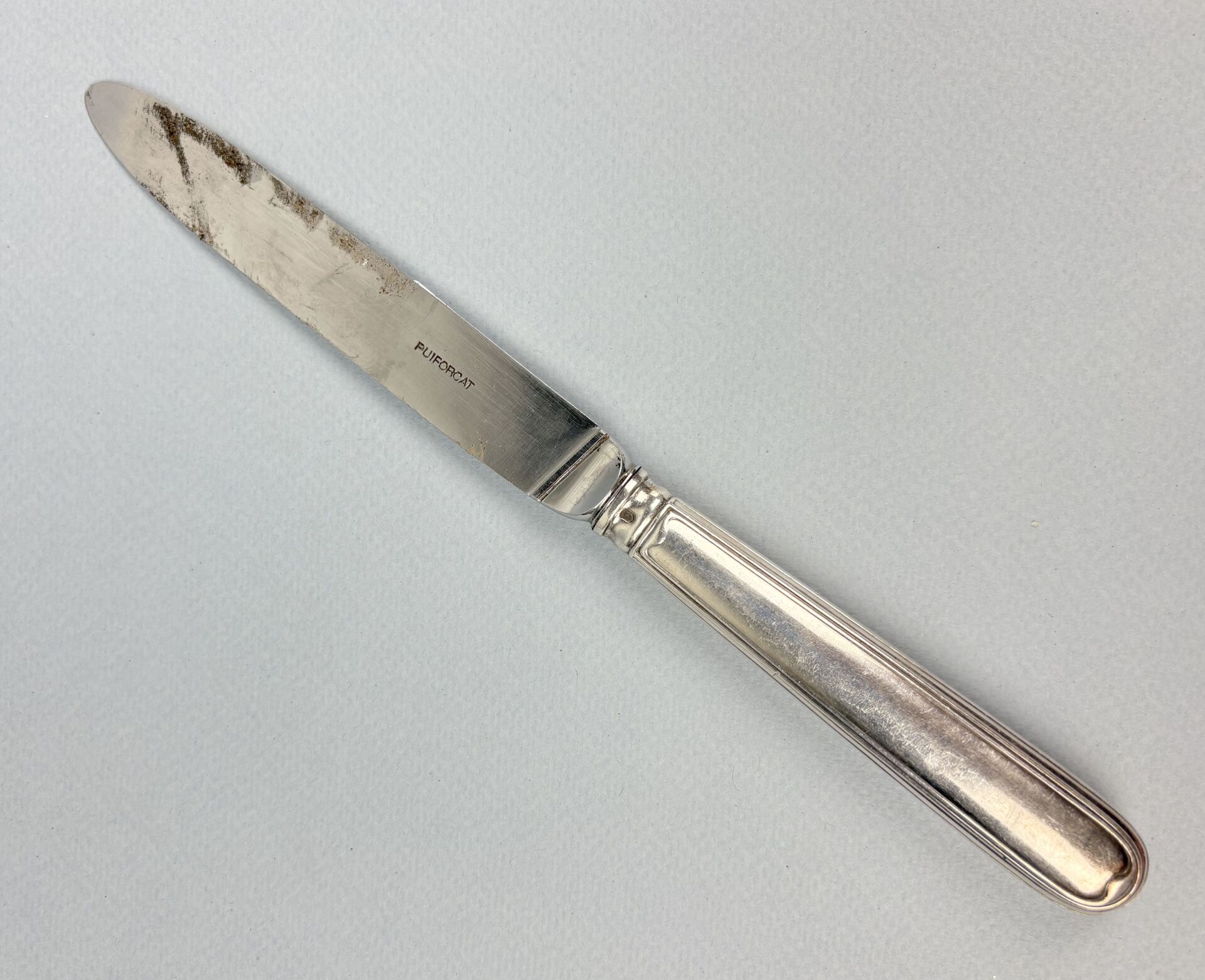 PUIFORCAT Couteau en argent, poinçon Minerve, lame en acier, manche à décor de filets Poids brut : 118 g