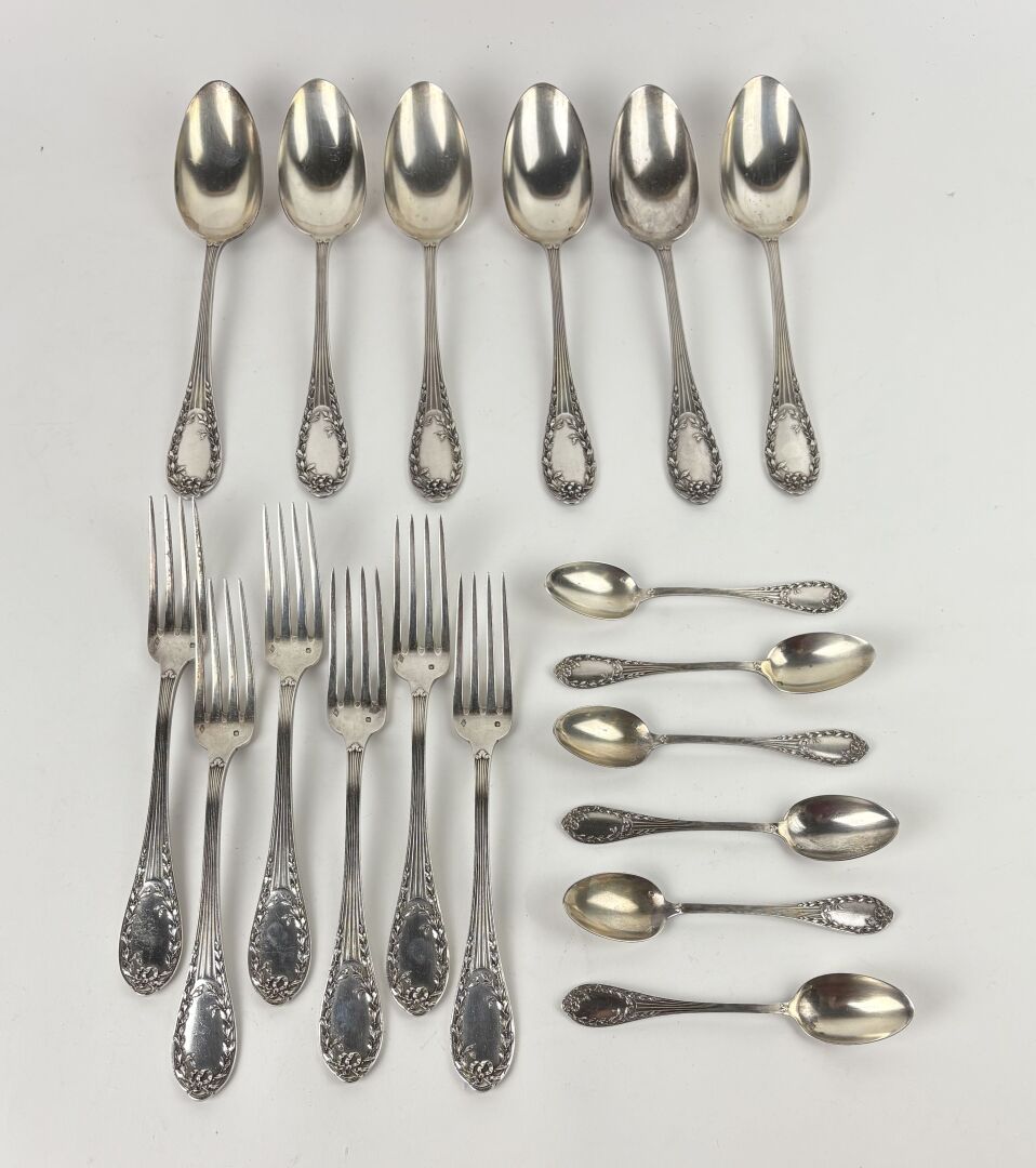 Partie de ménagère en argent (925 millièmes), poinçon minerve à décor de style Louis XVI comprenant : - 6 Couverts - 6 Cuillères à dessert