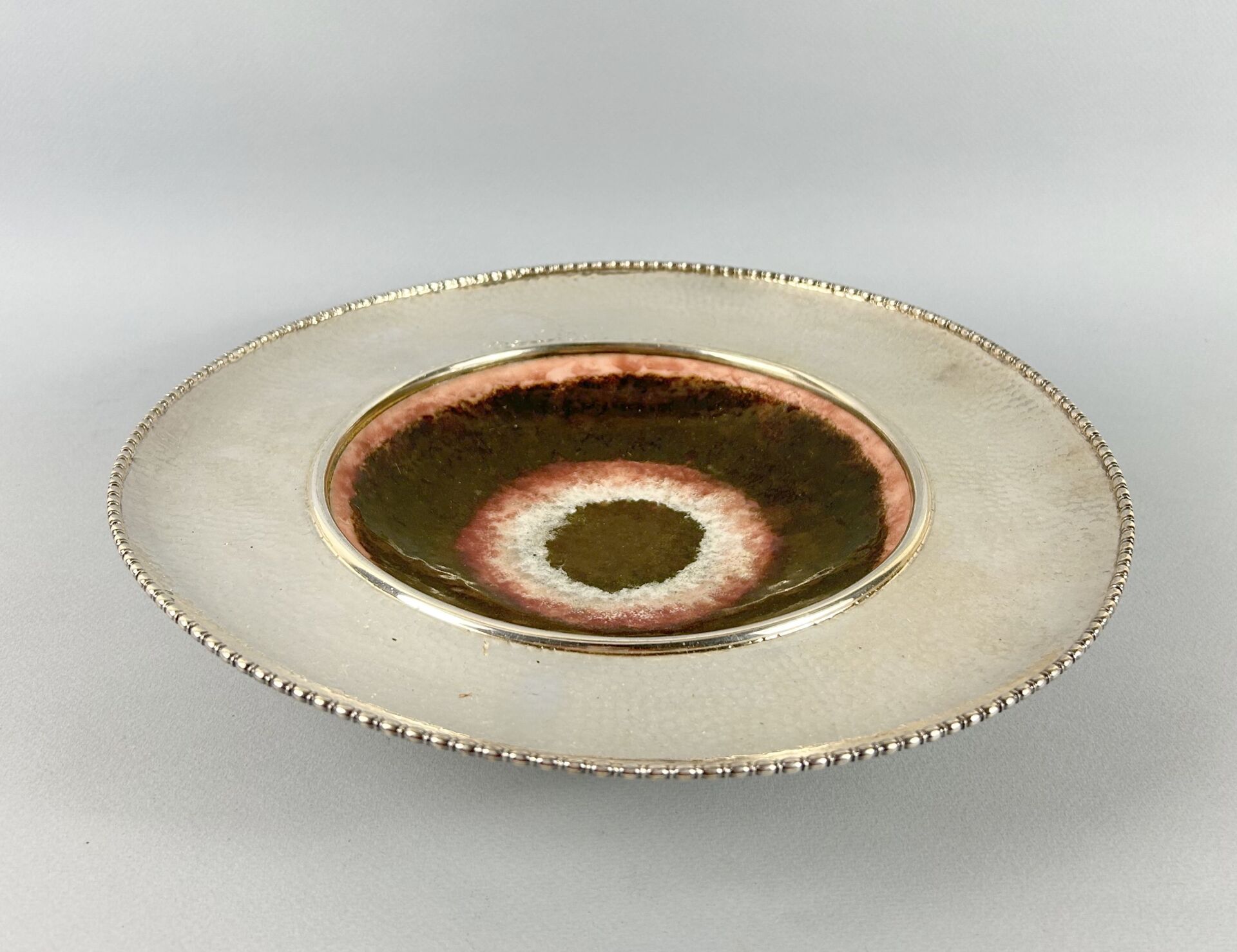 Plat creux en faïence émaillée cerclé d'un important marli en argent martelé Poids Brut : 829 g.