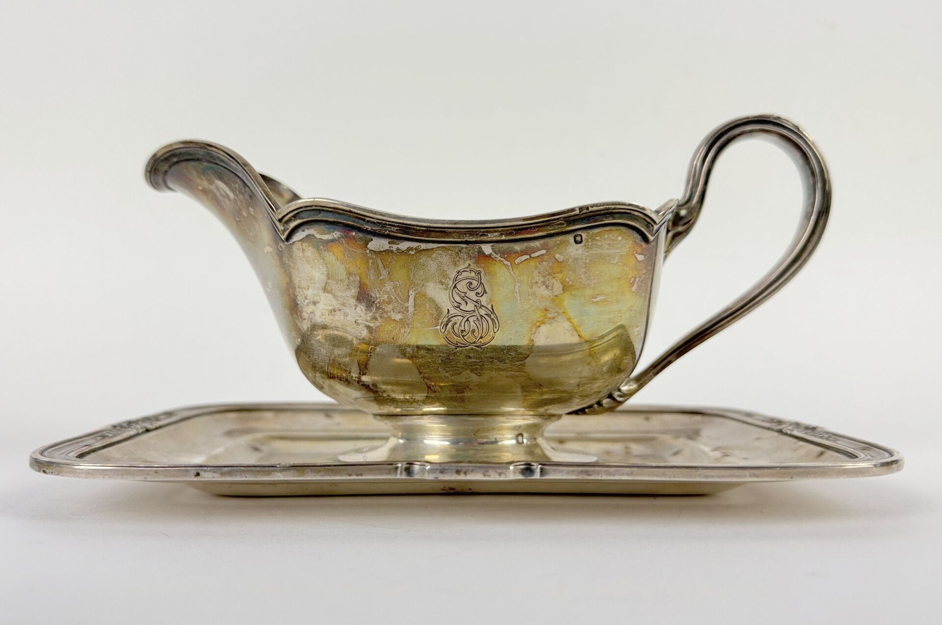 Saucière en argent (925 millièmes) poinçon minerve et son dormant fixe, modèle à filet pincé, à décor de ruban noué et frises végétales, chiffrée "GS" Maitre orfèvre : Ravinet & Compagnie Poids : 651 g.