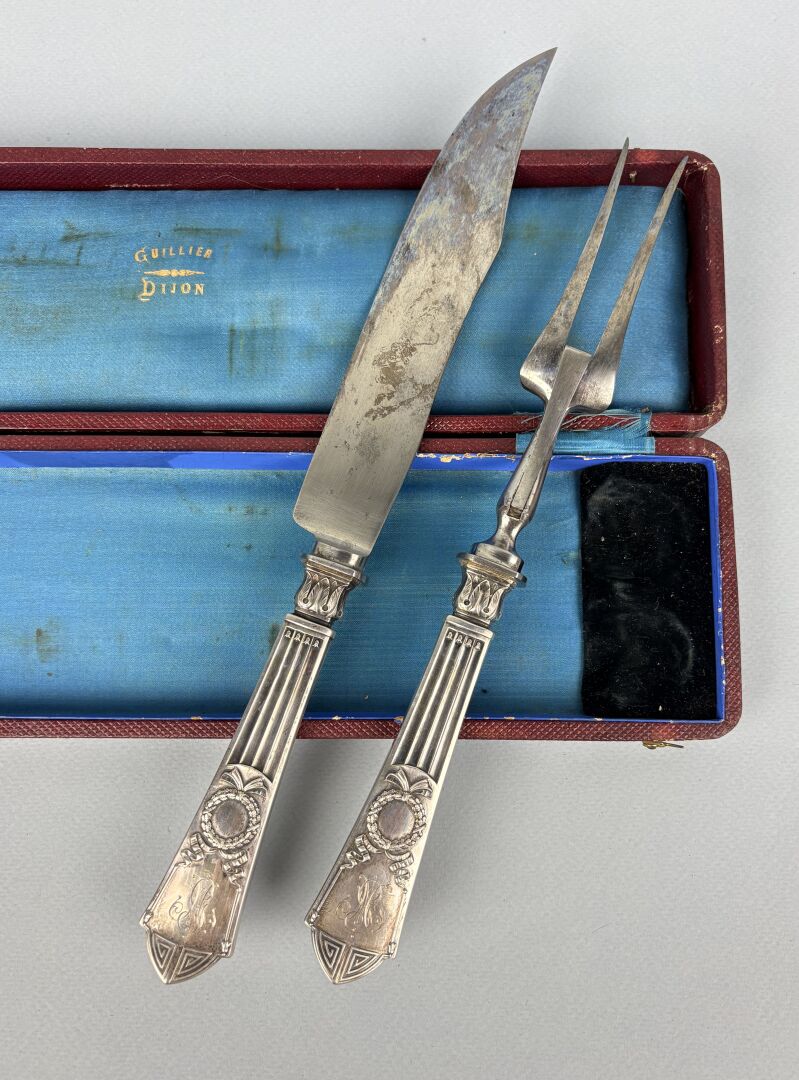 Service à découper en métal argenté, manche en argent fourré (800 millièmes) à décor Empire Dans un écrin Poids brut : 244 g