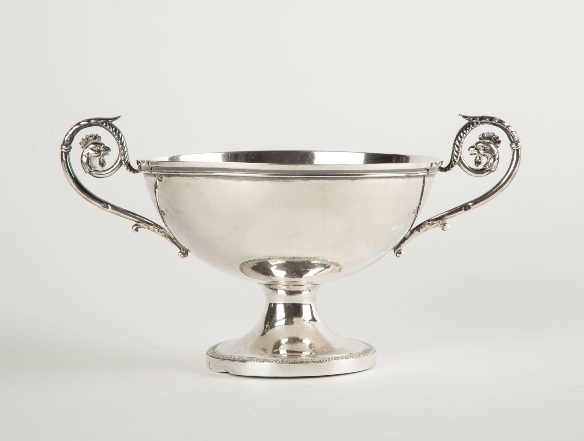 Coupe sur piédouche en argent (925 millièmes), poinçon au premier coq, à décor de frise de palmettes, les anses terminées par une tête de coq Maitre orfèvre illisible Poids : 278 g