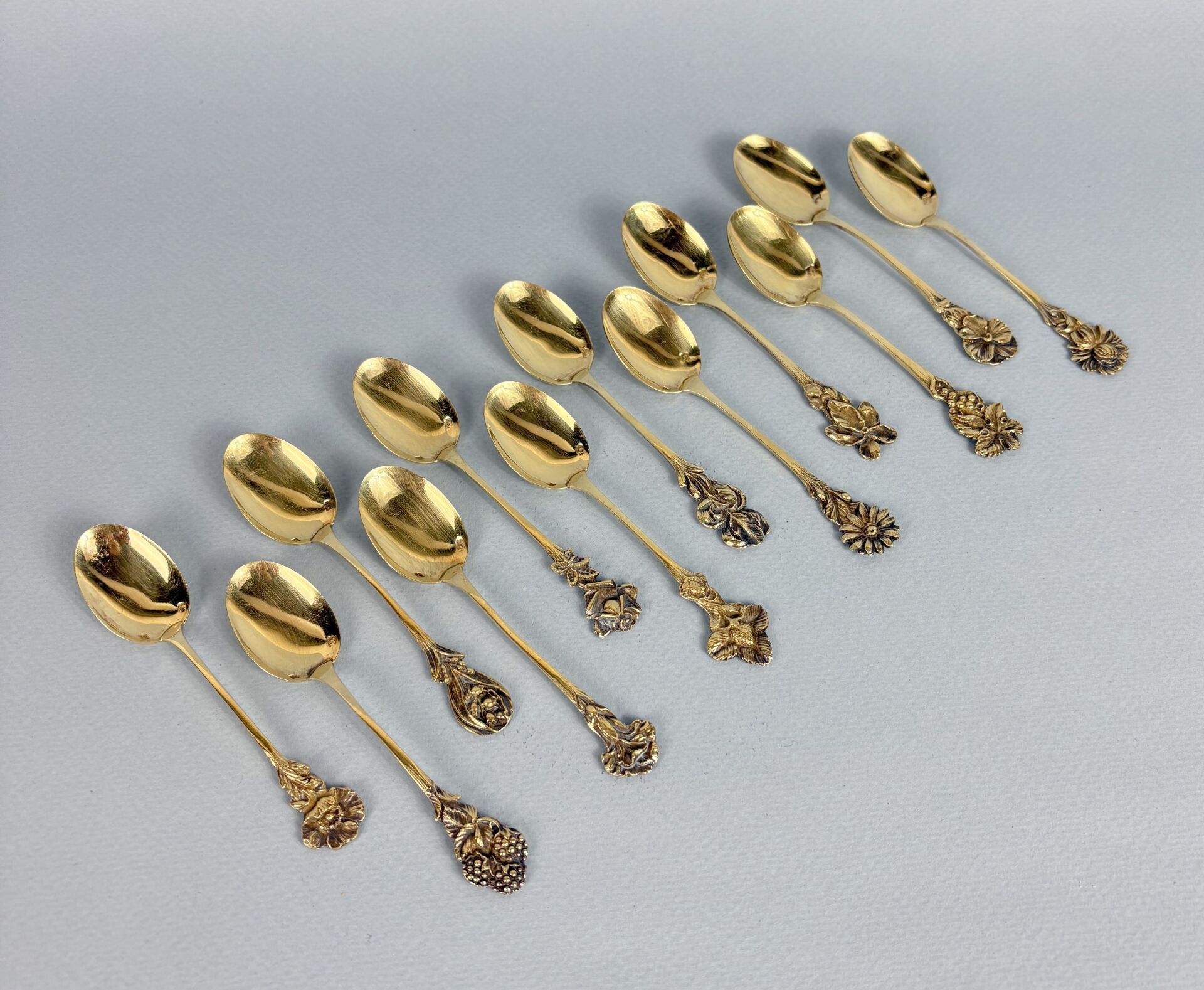 Suite de douze petites cuillères en vermeil, poinçon Minerve, le manche à décor de fleurs, douze modèles différents Travail Art Nouveau Maître Orfèvre illisible Poids : 132 g