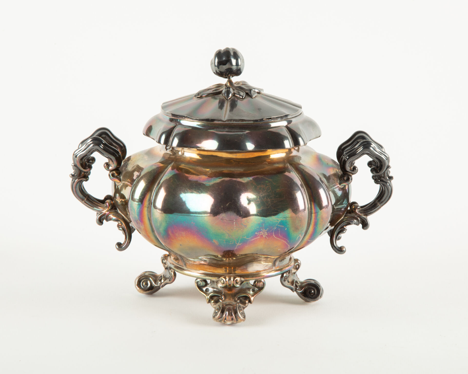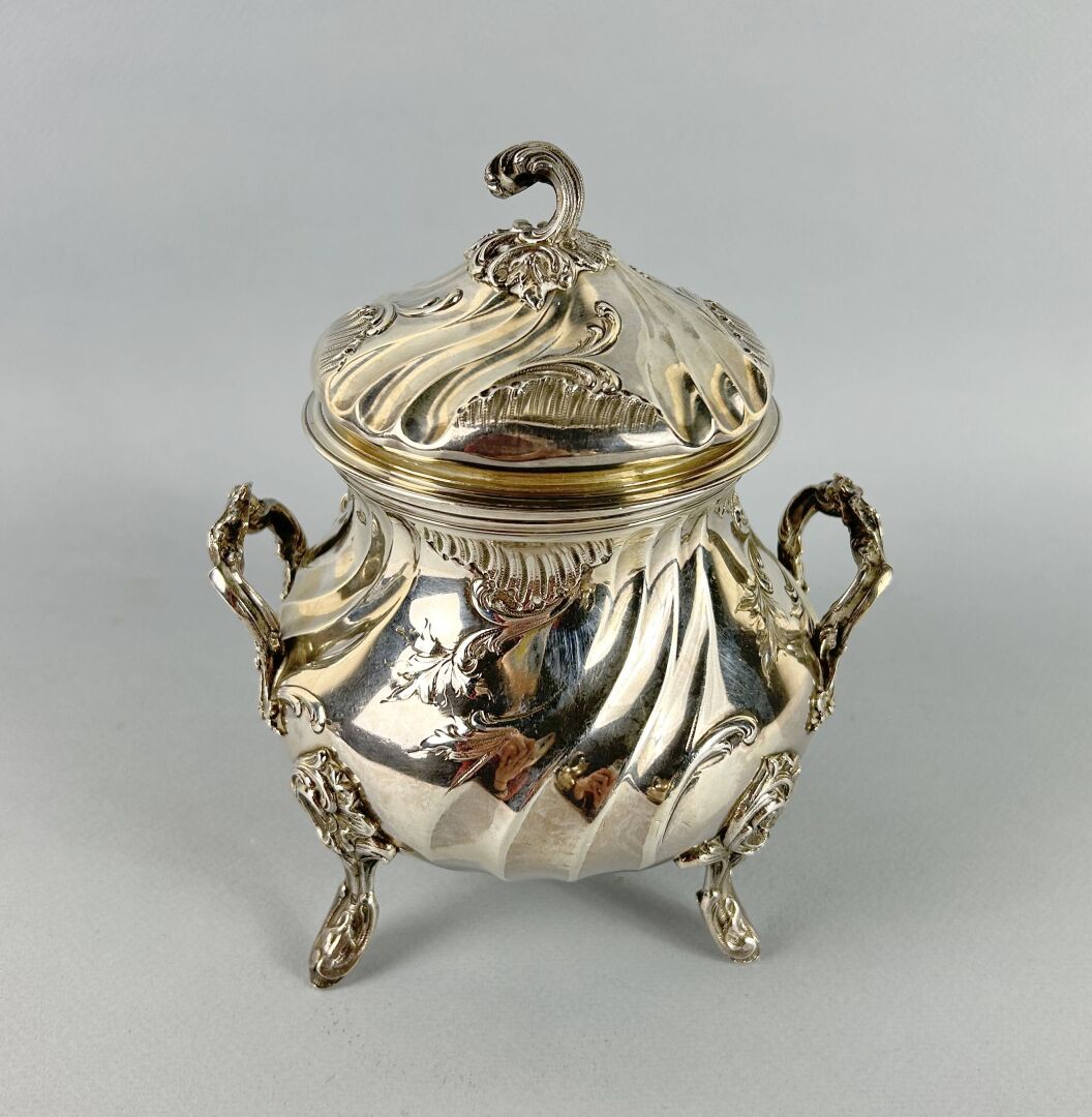 Important sucrier en argent (925 millièmes), poinçon Minerve, à décor rocaille, le frétel figurant un fruit, Maitre Orfèvre DEBALY H : 17 cm Poids : 472 g.