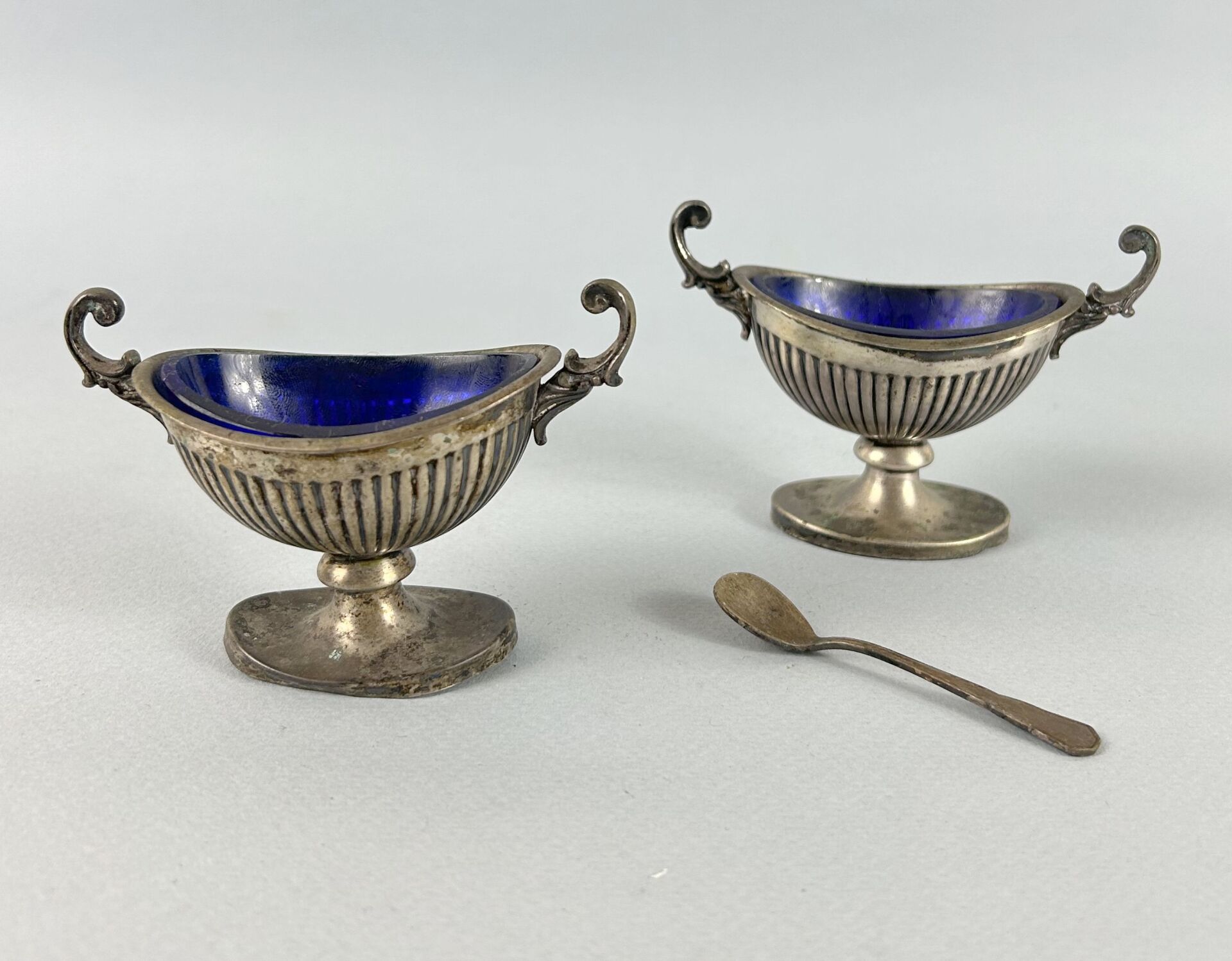 Paire de salerons navette en argent (800 millièmes) de style Empire, coupelles en verre bleu. On y joint une pelle à sel Chocs Poids : 88 g