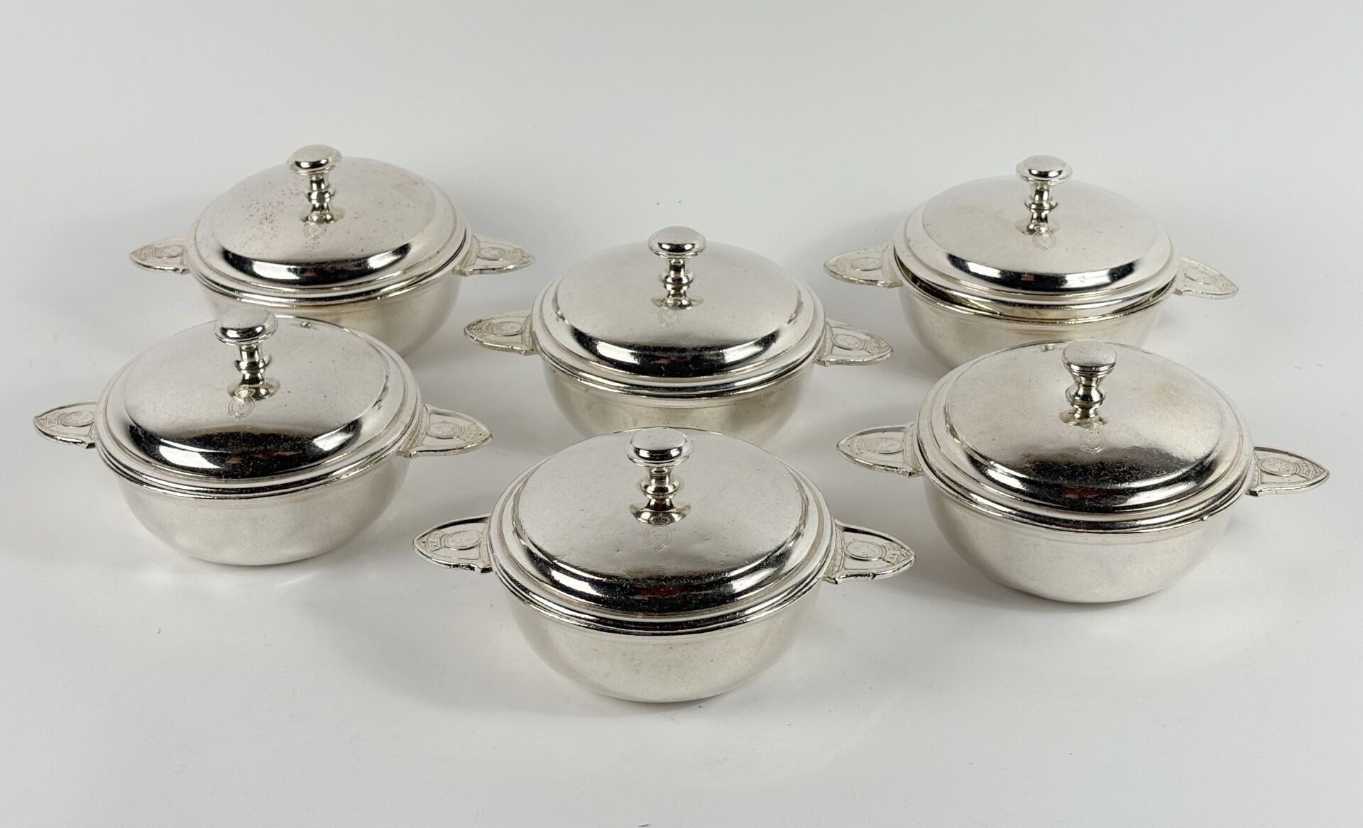 CHRISTOFLE pour l'Hotel Georges V Suite de six bouillons couverts à oreilles en métal argenté frappés du blason de l'établissement Légers chocs et rayures d'usage D : 20 cm